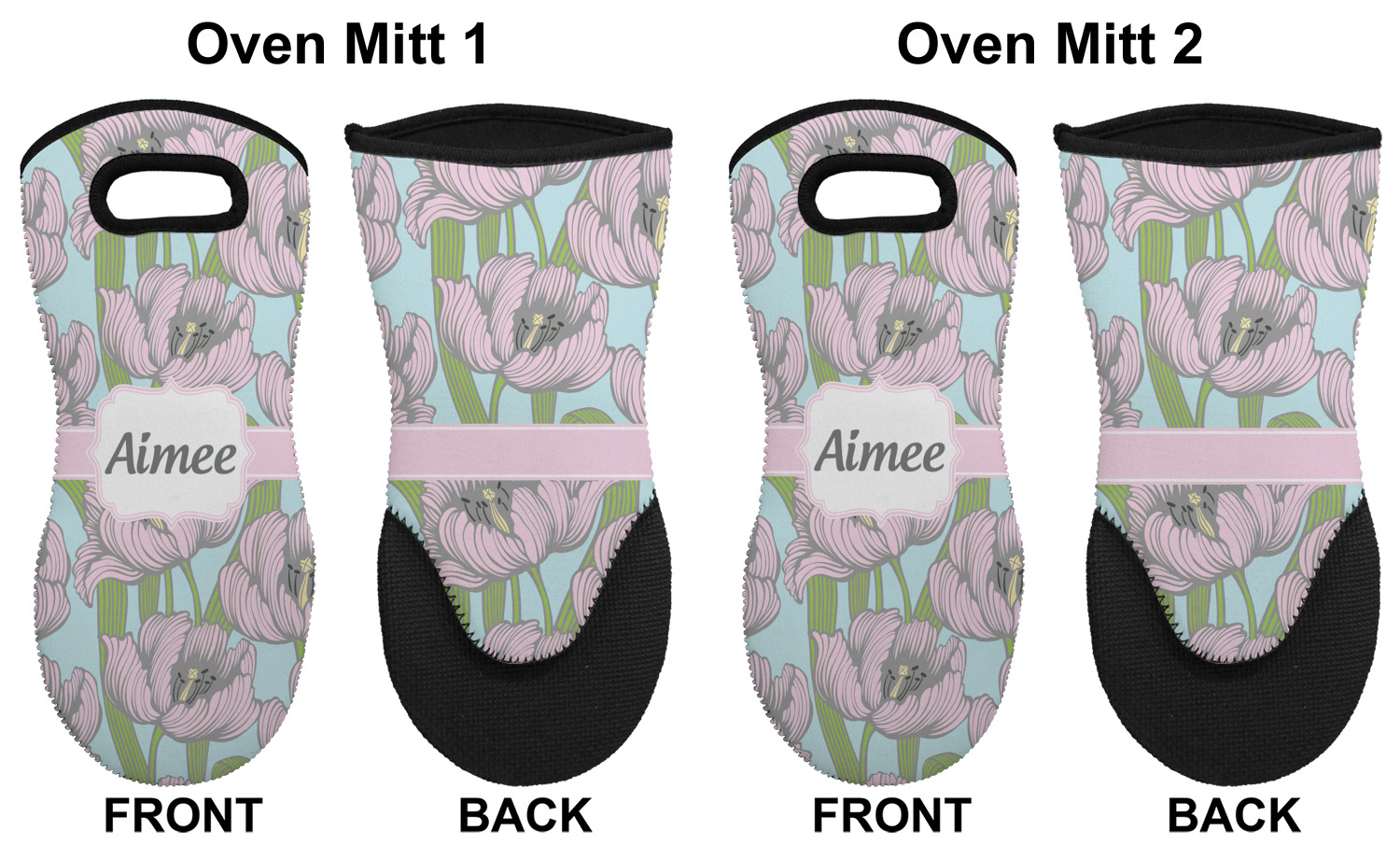These heat resistant gloves are made entirely of a durable neoprene; the front features a softer texture, while the palm's side has a textured surface, meant to handle heat up to 500 degrees Fahrenheit. Thick, heavy duty stitching connects the two sides. A small, oval cutout appears on the front, and can be used to hang and store the mitt. Your personalization appears on the front, and the upper part of the back of the mitt. The style of these oven mitts are suitable for both the right and left hand, depending on your needs. If you need one for each hand, be sure to order two!