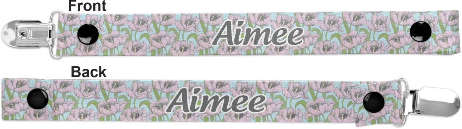 This personalized pacifier clip is the ideal size and measures at approximately 7.5 inches in length, when either end is snapped closed. On one end, you'll find a snap button. This button of your baby's pacifier holder is what can be attached to their pacifier to hold is securely in place. Simply open the snap, slip it through the pacifier opening, and snap it back into place. On the opposite end of this baby pacifier holder, you'll find a metal clip that can secure to a baby's collar or sleeve. This clip ensures that the strap stays in place, and that your baby's pacifier is always on hand.