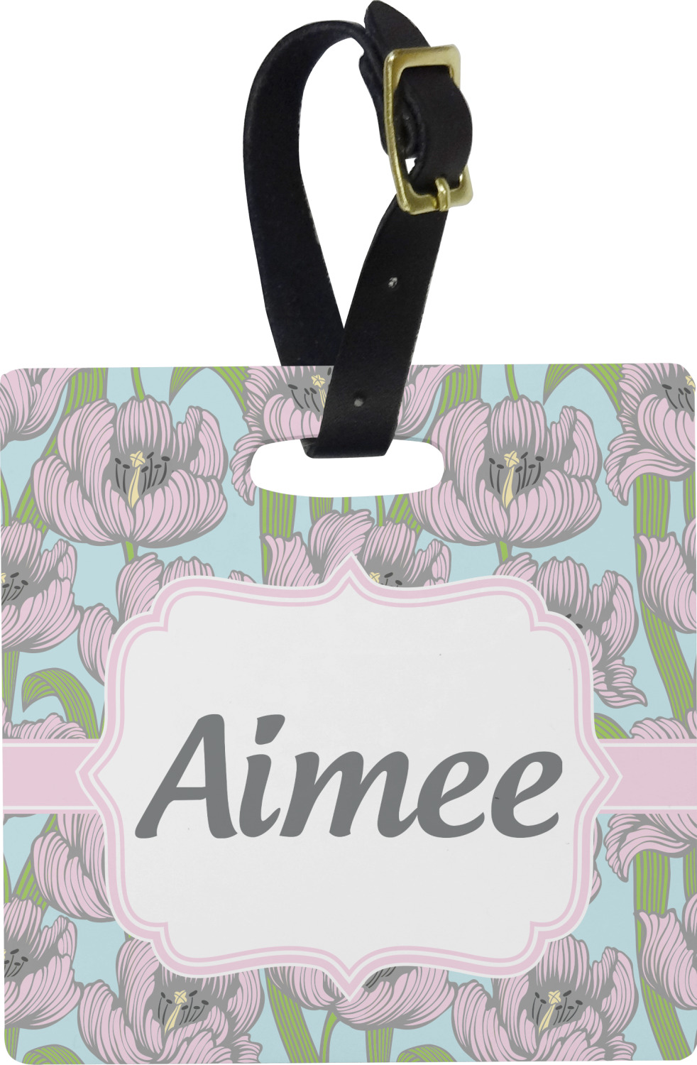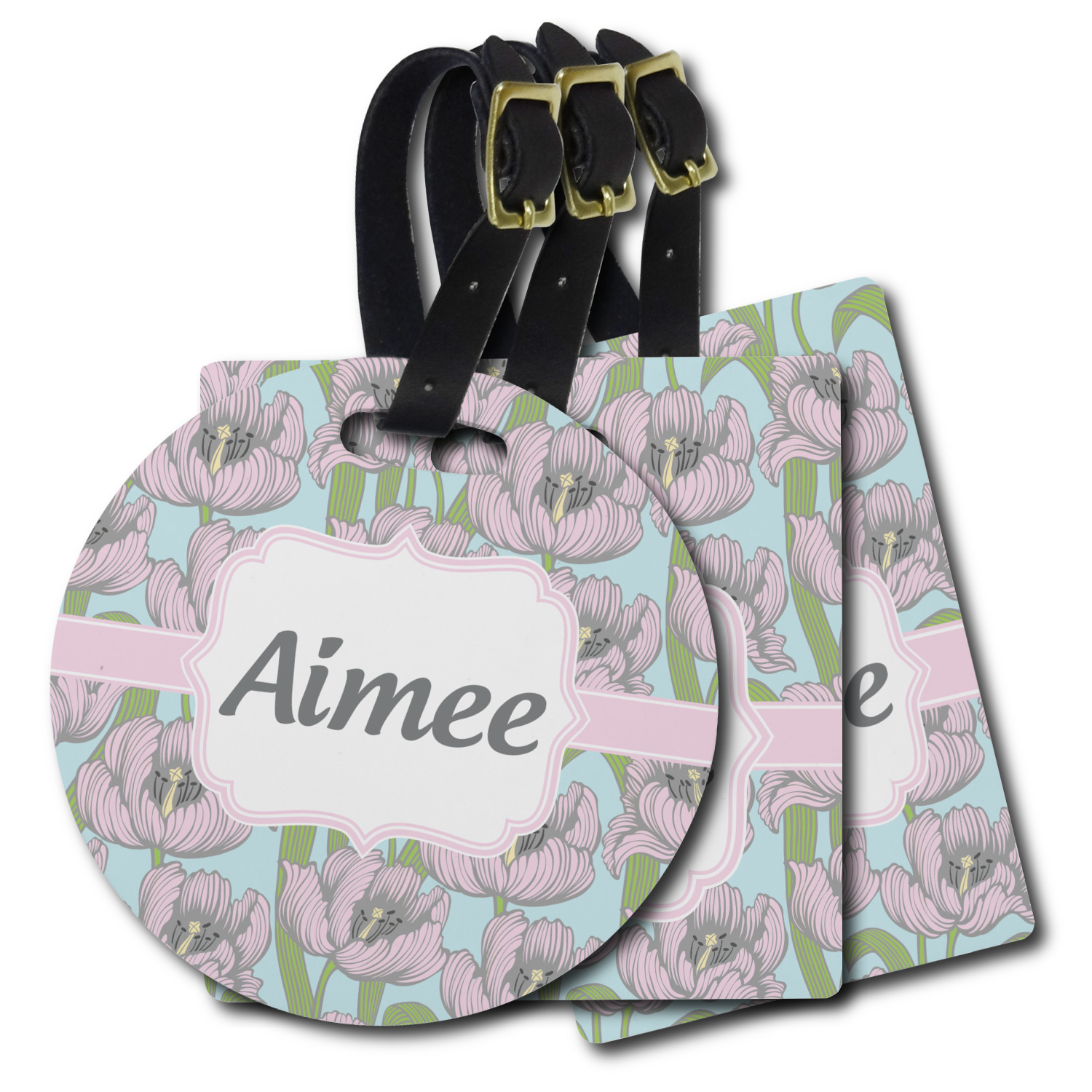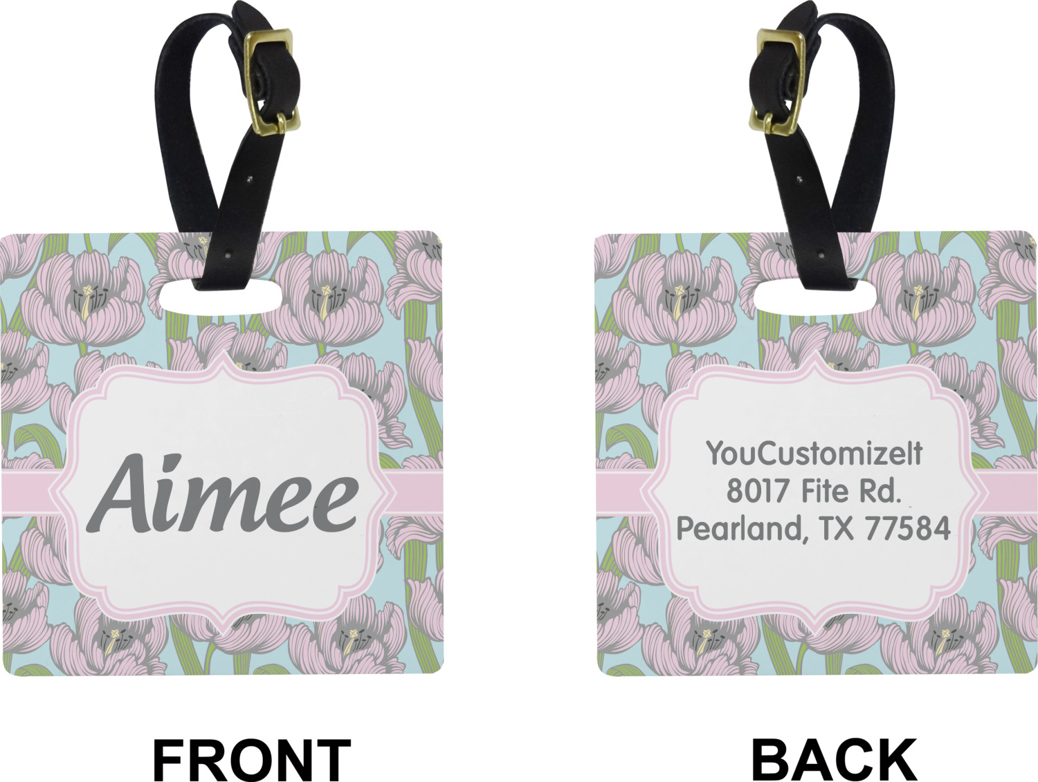 These personalized bag tags are sold in a variety of shapes, so that you may find the product that meets your vision exactly. We sell a round luggage tag, which measures at approximately 4" x 4". Our square luggage tag is about 3.5" x 3.5", while our rectangular version is 2.75" x 4 ".
