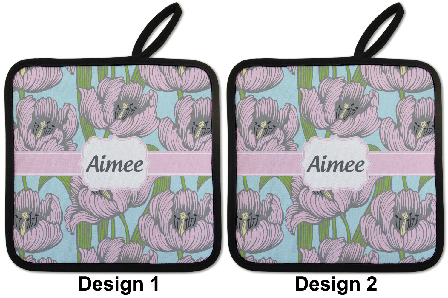 Our personalized pot holders feature a neoprene front that displays your personalization in vibrant colors. The backing of the hot pot holder is rubberized; the textured backing allows you to have a great grip when using this custom pot holder. The two materials are joined with a sleek, black trim, and the holder also includes an attached loop for hanging and storage. The pot holder is approximately 8.75 inches by 8.75 inches and 0.25 inches tall, while the fabric loop is 2.5 inches long. You can purchase a kitchen pot holder by itself or as a set of 2. We also offer a set including one pot holder and one oven mitt.