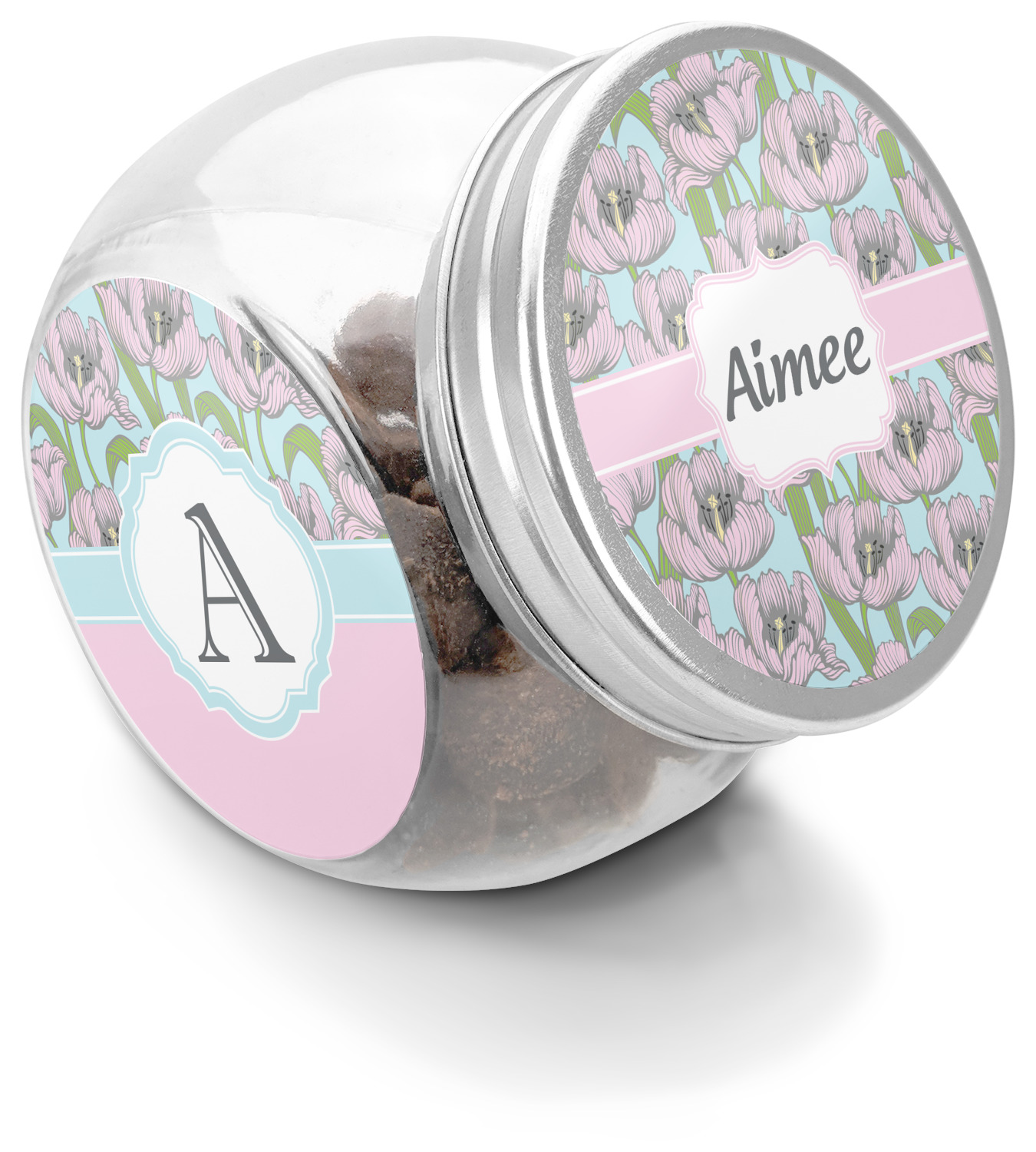 This treat jar is an excellent way to store treats for your favorite canine or feline. Moreover, their delicate, classy appearance makes them a tasteful addition to your countertop's décor. Crafted from clear glass, its unique construction and silver metal, screw-on lid allows for quick and easy access. Three, permanent, vinyl stickers are applied to both sides of the jar and lid, presenting your personalized design. The base of this glass, dog treat jar is 3.4" x 4.75", and the jar stands at 5" tall. Though on the smaller side, this jar is best suited for smaller treats or training treats.