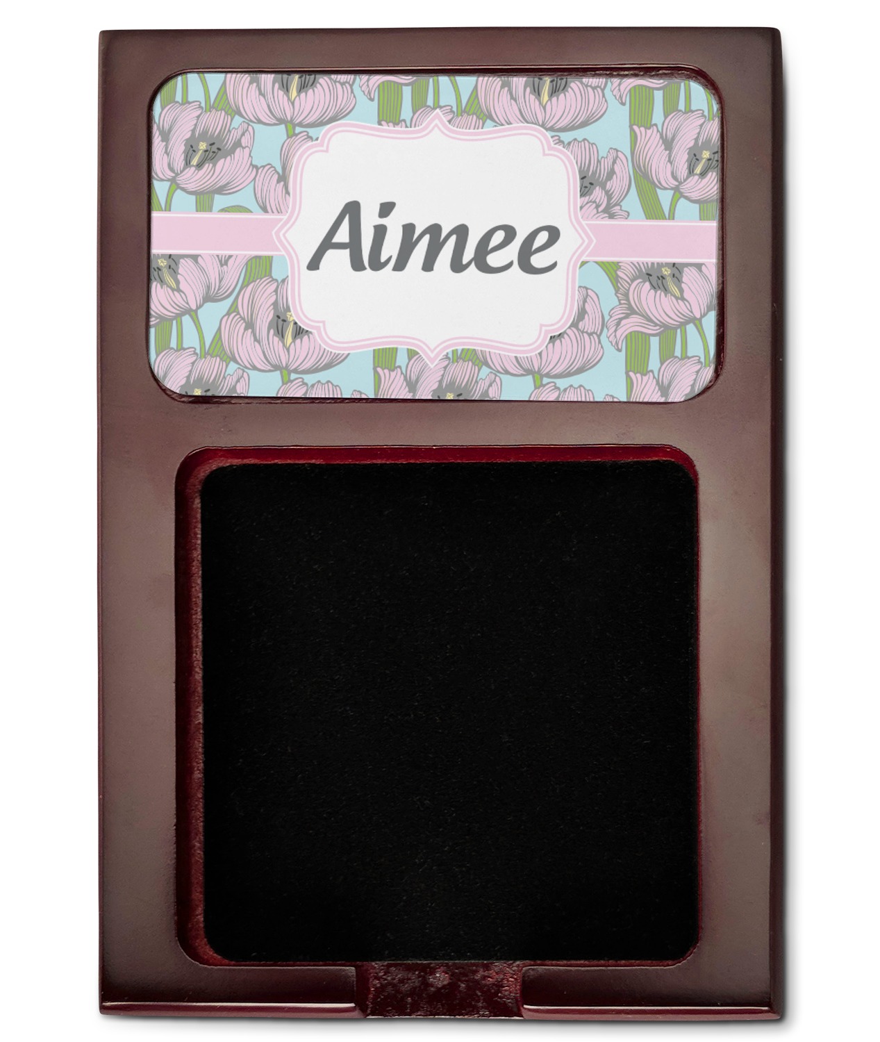 Crafted from a fine mahogany, this post it note holder is in the shade of a dark, cherry color. The dispenser itself is about 4.25 by 6.25 by 0.75 inches. You can place your 3 by 3 inch sticky notes in the indentation below the nameplate. We print your customization onto the nameplate that rests above the velvety indentation.