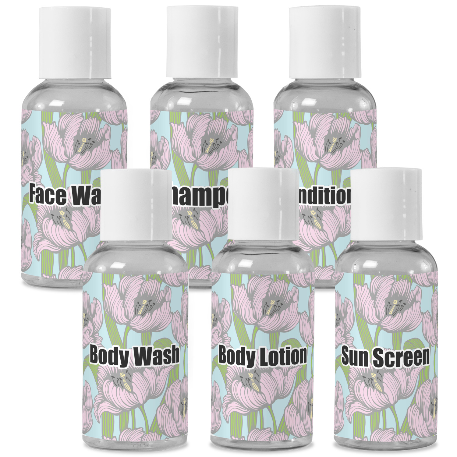 These soap and lotion travel bottles are the perfect place to start. Each set comes with 6 clear plastic bottles with white pop top lids. The bottles are cylindrical and can hold approximately 2.7oz. Perfect for plane travel!