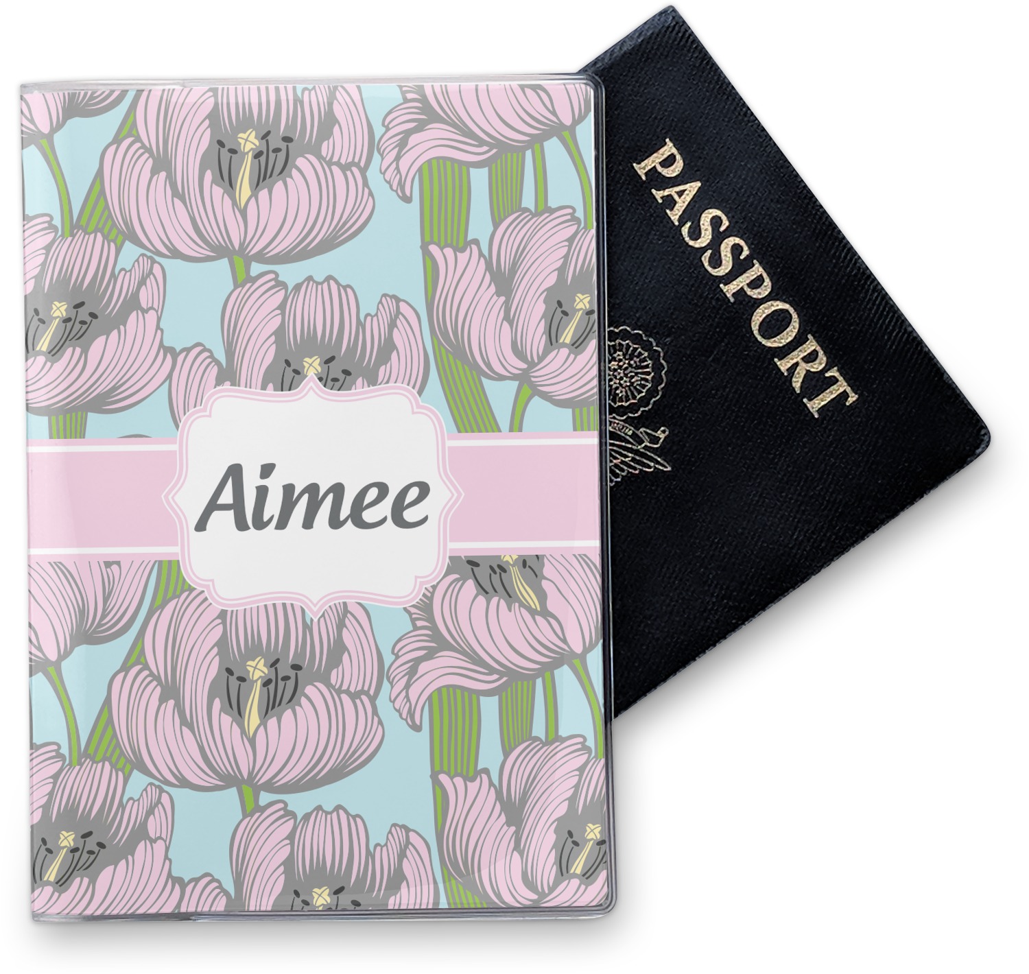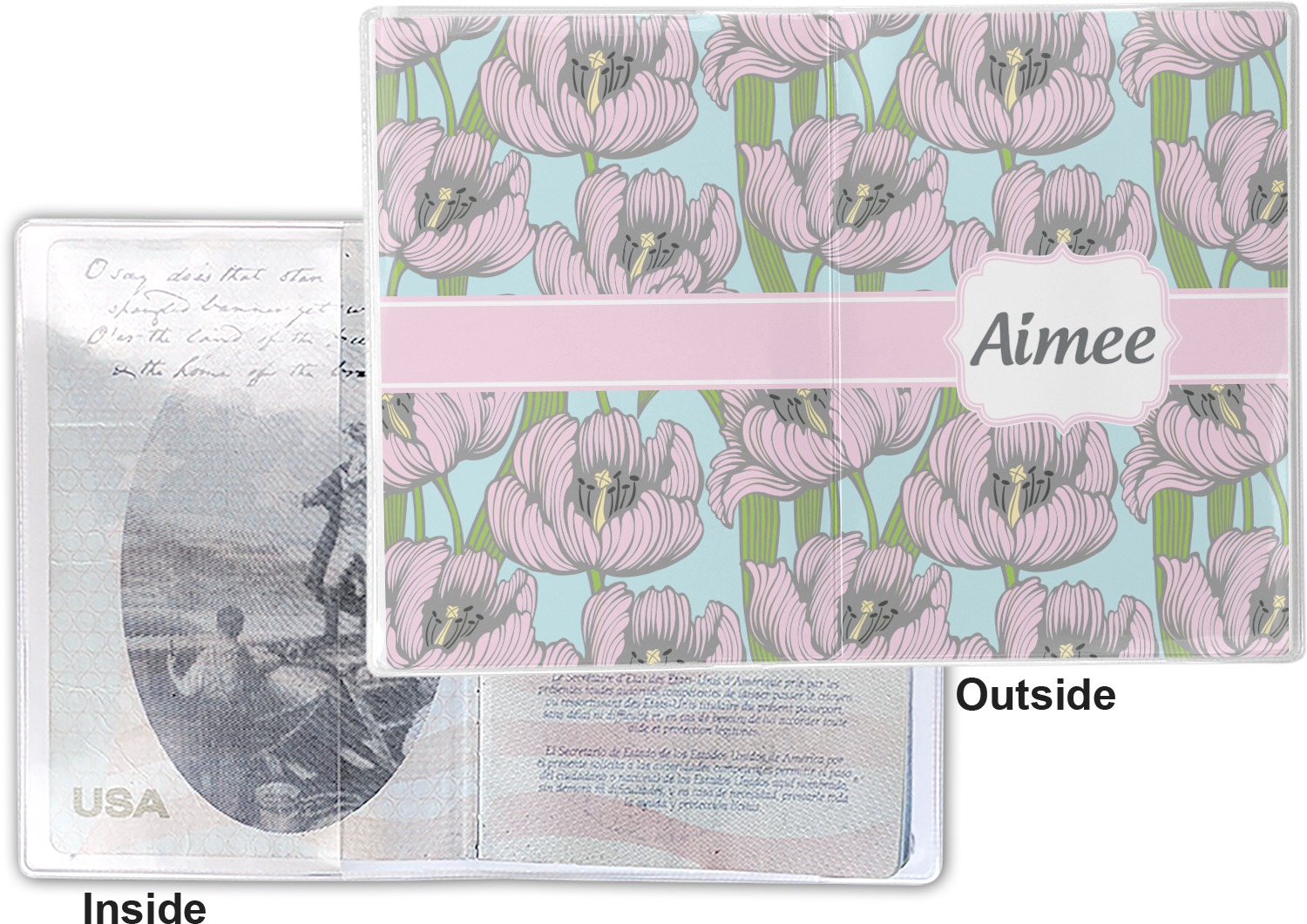 This cover is made of a sturdy clear vinyl with a personalized vinyl insert inside. There is a large and a small pocket on either side to hold the covers of your passport easily and firmly. The passport holder is approximately 7.5" x 5.25", the perfect size to snugly fit your passport. This slim cover is the perfect way to protect your passport without being one more bulky item you have to carry.