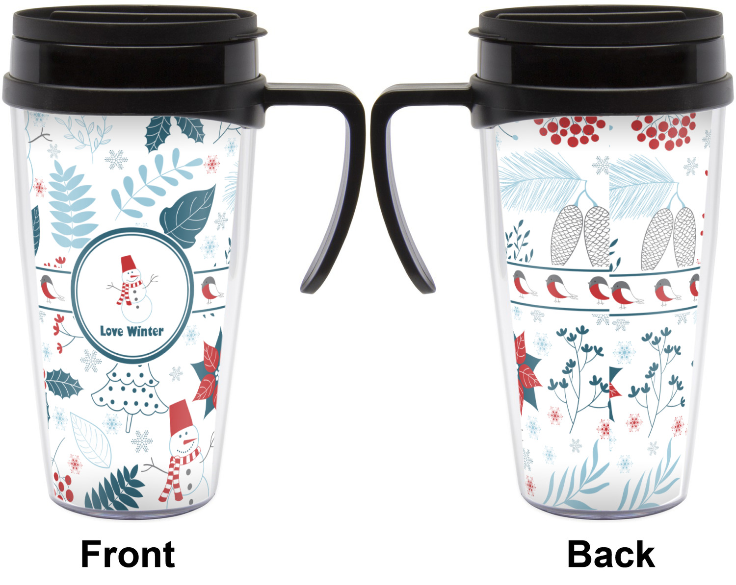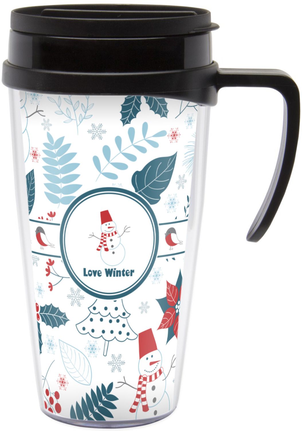 These thermal mugs are free of BPA, and insulated, to keep your drinks hot or cold. The black, snap on lid and the slider for sipping allows you to conveniently sip your drink without constantly worrying about a disastrous spill. We offer this mug with and without a handle, to better suit your needs. Each custom thermal mug holds up to 16 ounces of liquid and displays your customization on all sides on premium gloss media inserts.