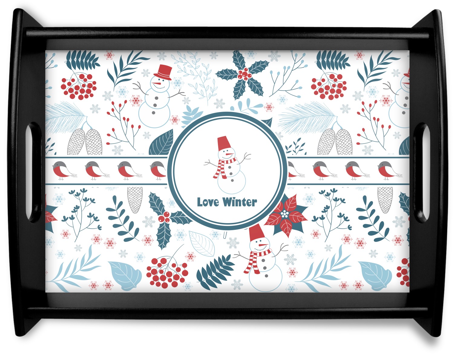 This serving tray with handles features square edges and two rounded sides, creating a very modern look. Each side is fabricated from a beautifully cut, natural wood. The bottom of the interior of the tray displays your customized design in bright, vibrant color. The tray is sold in both a black color and a natural wood look. Each variation of the wood serving tray has two sizes: Small, which is 14" x 10" x 2.25", and Large, which is 19.5" x 13.5" x 2.75".