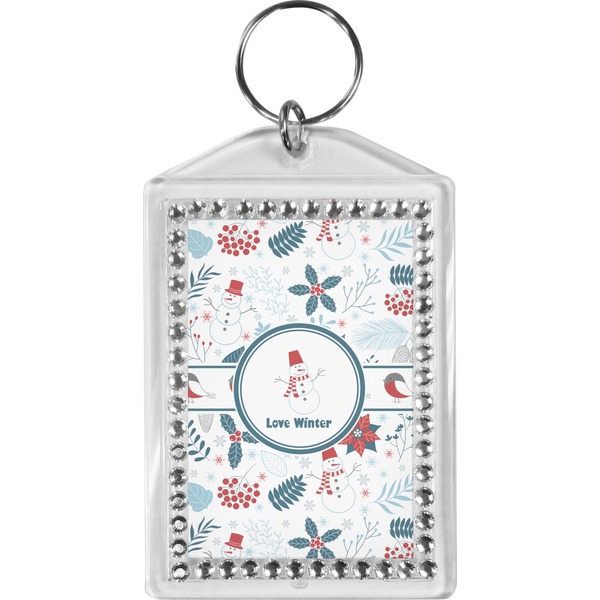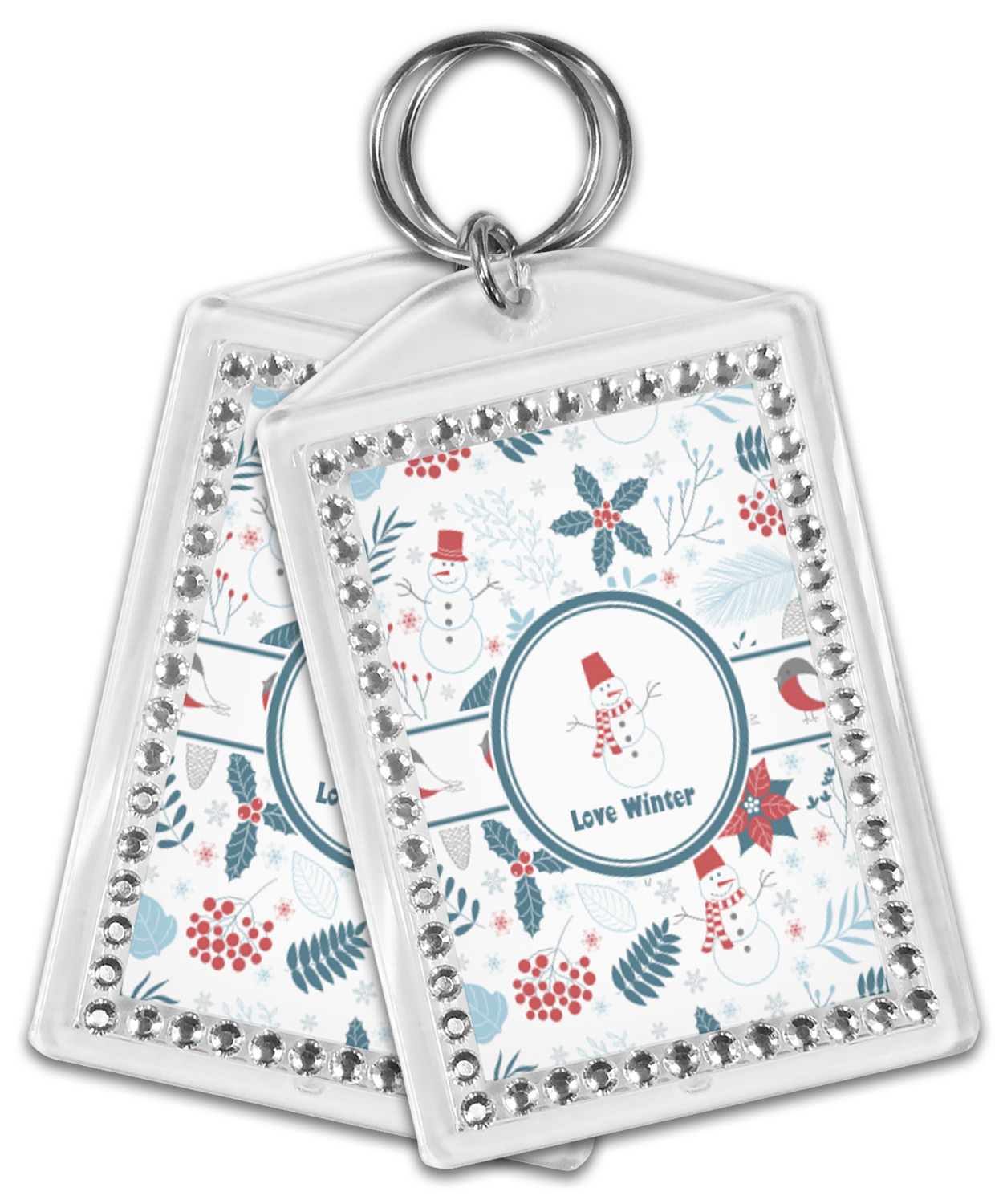 Our personalized keychains have a bold, rectangular shape, outlined by a series of shimmering rhinestones. A metal, split keyring is included with your purchase, and an additional metal hoop allows for attachment of the keychain to the split ring. This unique keychain measures at about 3.75 by 2.5 inches. We print your customized design(s) across both the back and front of this keychain.