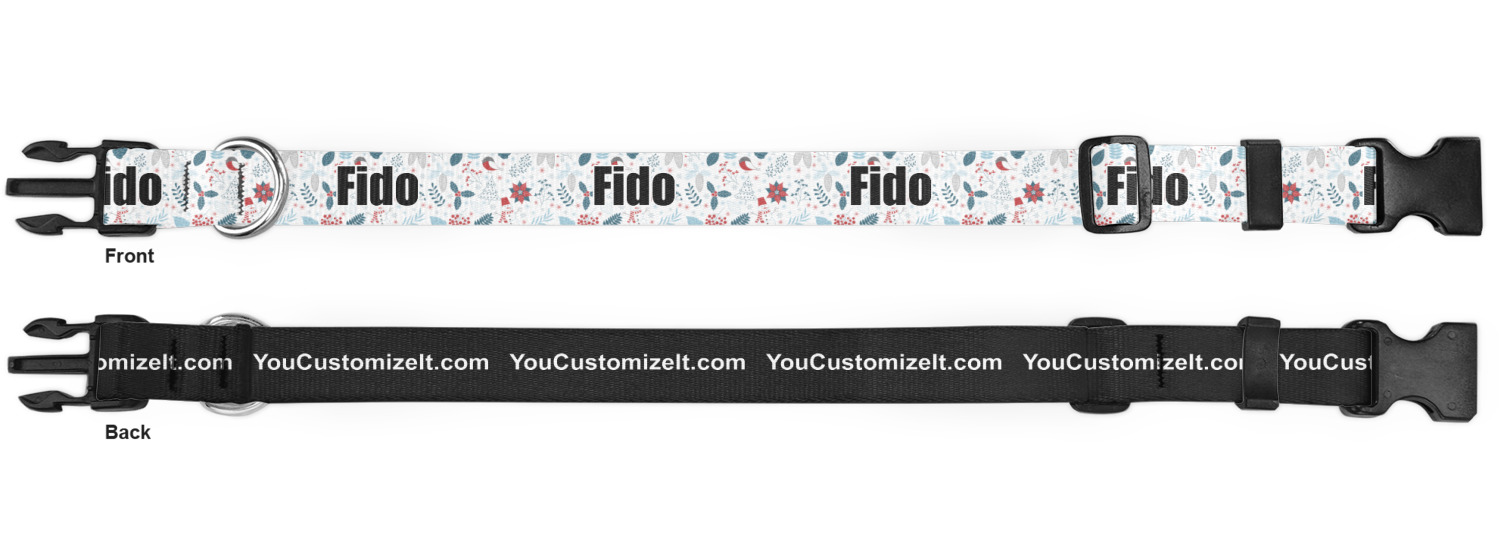 This sturdy collar, made from a durable nylon weave, will outlive your dog's episodes of excited tugging and pulling. Courtesy of its thick plastic buckle and adjuster, this collar is adjustable and accommodating of any dog. Structurally, the collar is a single piece of nylon weave that is sewn together, and features a solid metal loop where you can attach a leash or dog tag. We print and display your dog's name and pattern across the middle of the personalized dog collar.