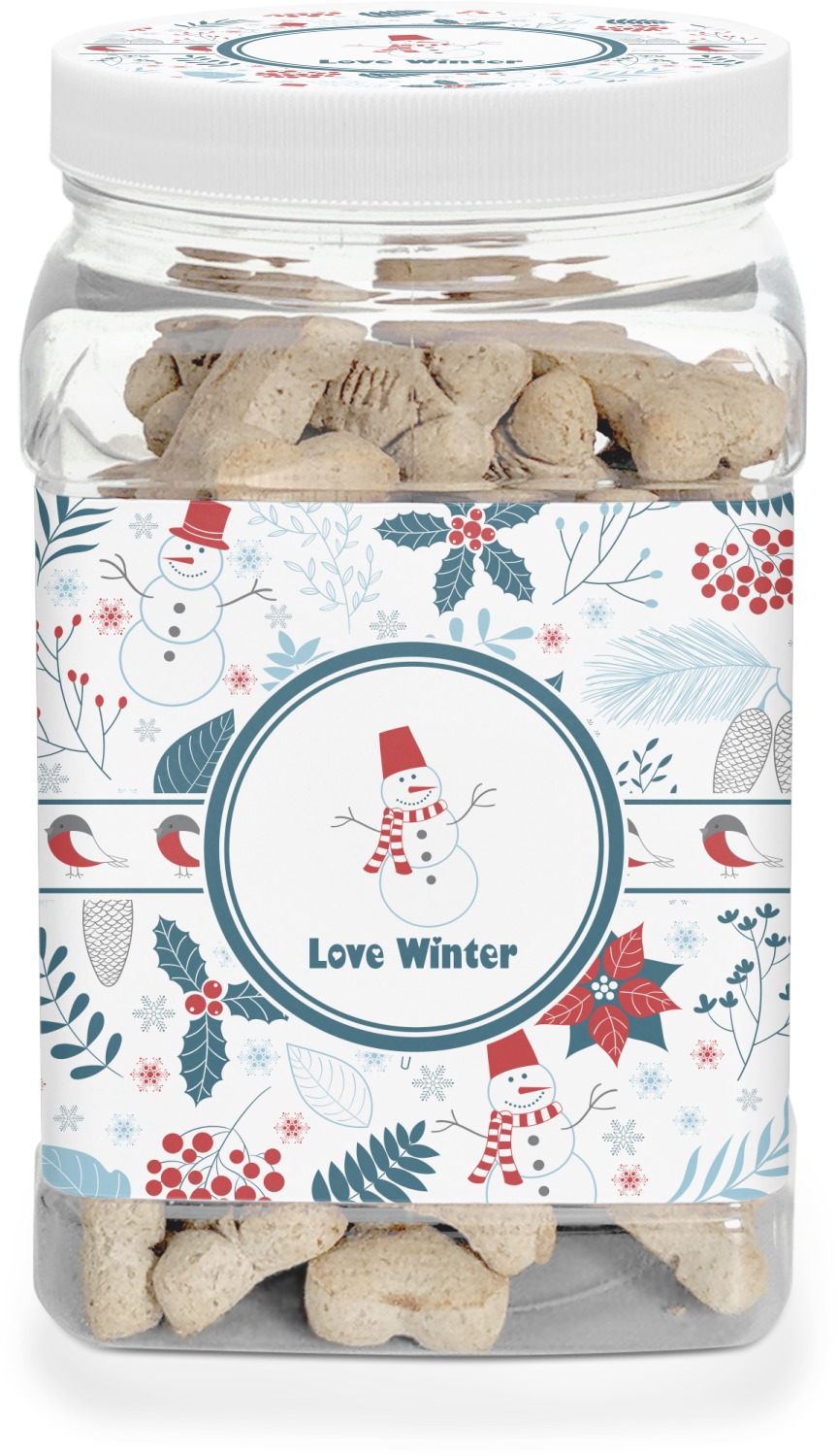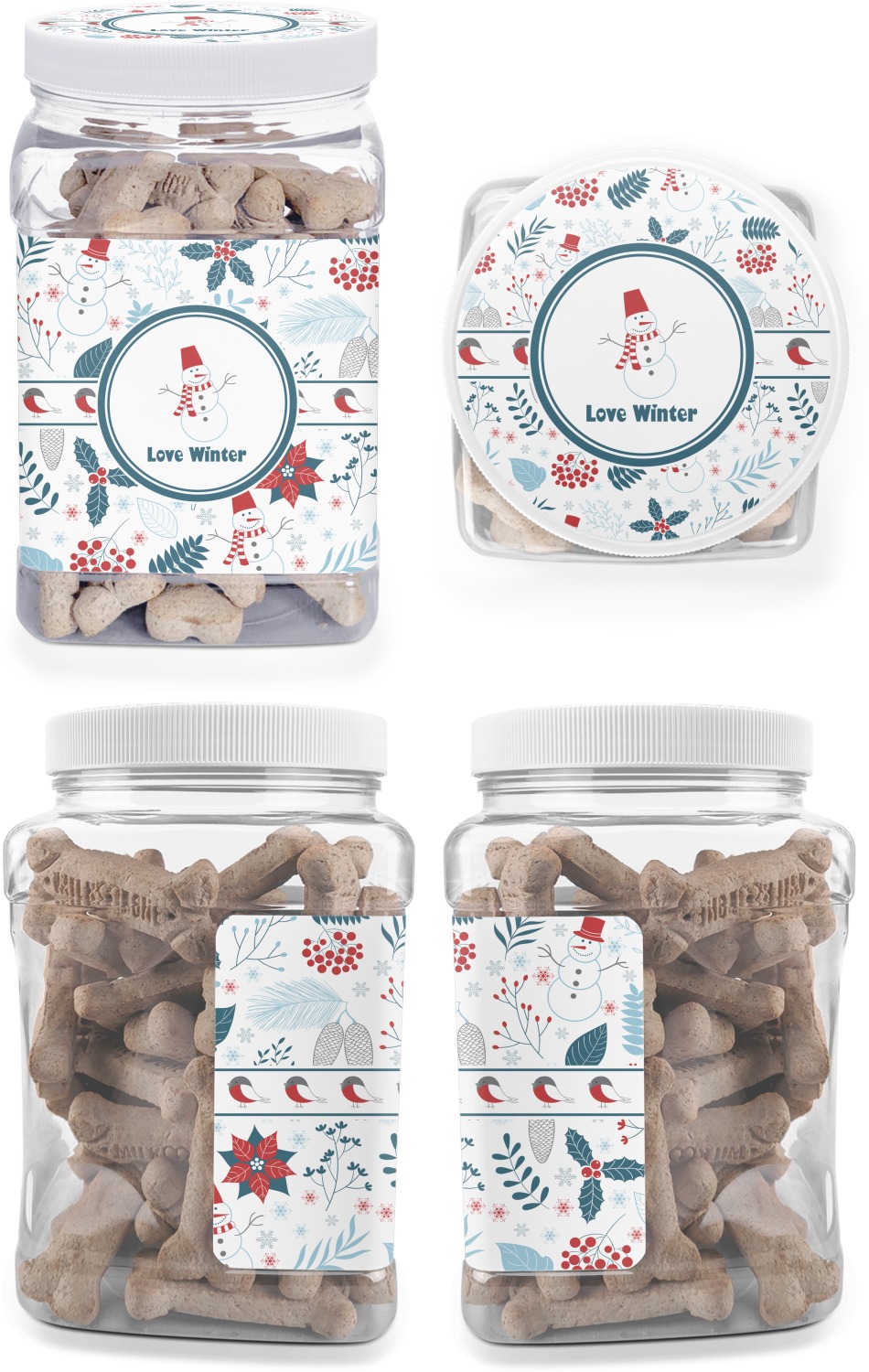 This half gallon jar, made from a sturdy plastic, is the perfect way to keep treats from any naughty pet paws, while still keeping them ready on hand for when your pup performs an impressive trick. This dog cookie jar features a screw-on, white lid that displays your personalized design on a vinyl sticker. We apply another customized sticker that wraps around the front and sides of the jar. Our dog treat jar also has indentations on the rear ends of the sides, which allows for convenient handling, and its square frame allows for easy storage.