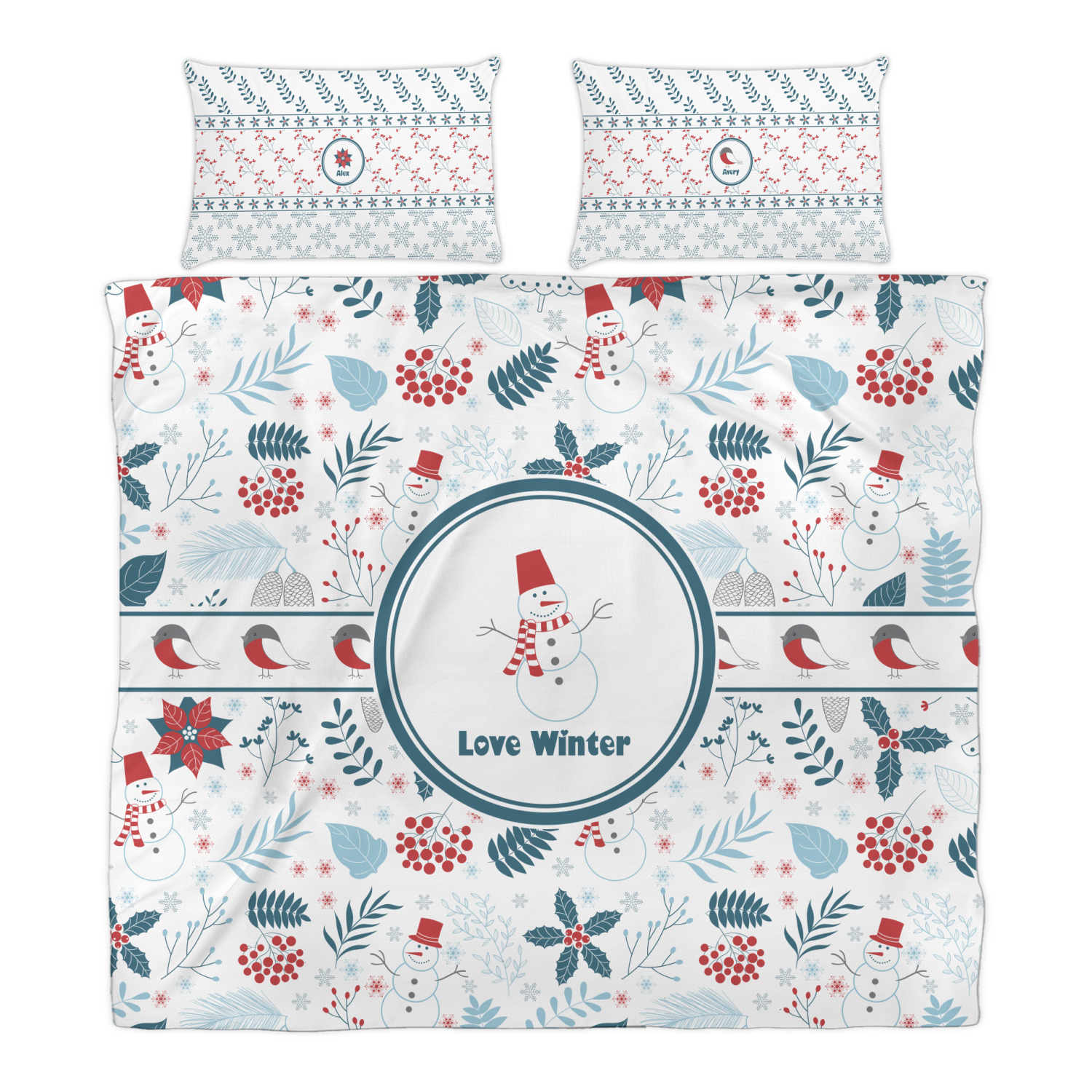 Do you love winter and are looking to winter designs to decorate with? This clean crisp winter design is a great reflection of winter white, with blues and a splash of red to give it color. The design has snow mans, winter birds, pine cones, berries, holly, leaves and snow flakes. Have a look the other designs that coordinate beautifully with this one and see how we created our own designs using the pattern maker and our favorite elements in this design.