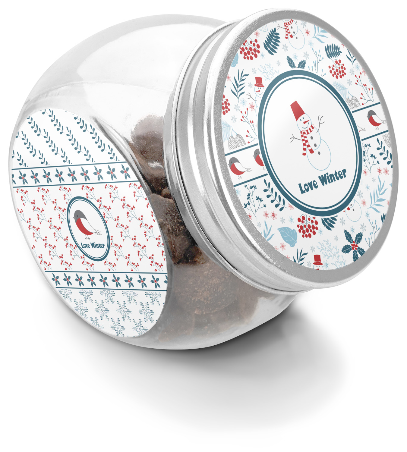 This treat jar is an excellent way to store treats for your favorite canine or feline. Moreover, their delicate, classy appearance makes them a tasteful addition to your countertop's décor. Crafted from clear glass, its unique construction and silver metal, screw-on lid allows for quick and easy access. Three, permanent, vinyl stickers are applied to both sides of the jar and lid, presenting your personalized design. The base of this glass, dog treat jar is 3.4" x 4.75", and the jar stands at 5" tall. Though on the smaller side, this jar is best suited for smaller treats or training treats.