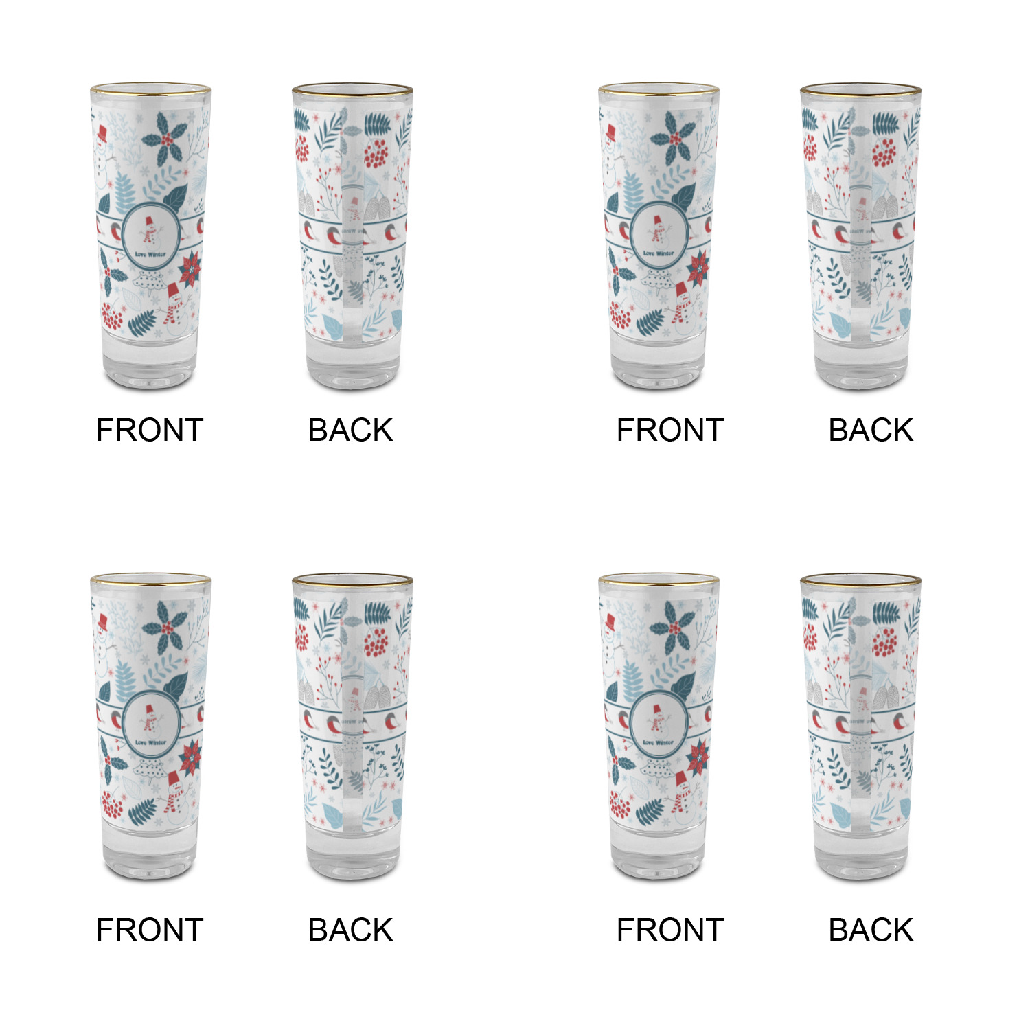 These glass shooter glasses are printed in full color with the design of your choice. These are a tall shooter 2 oz size and stand 4" tall. The print is a full wrap design to boldly display your personalization.