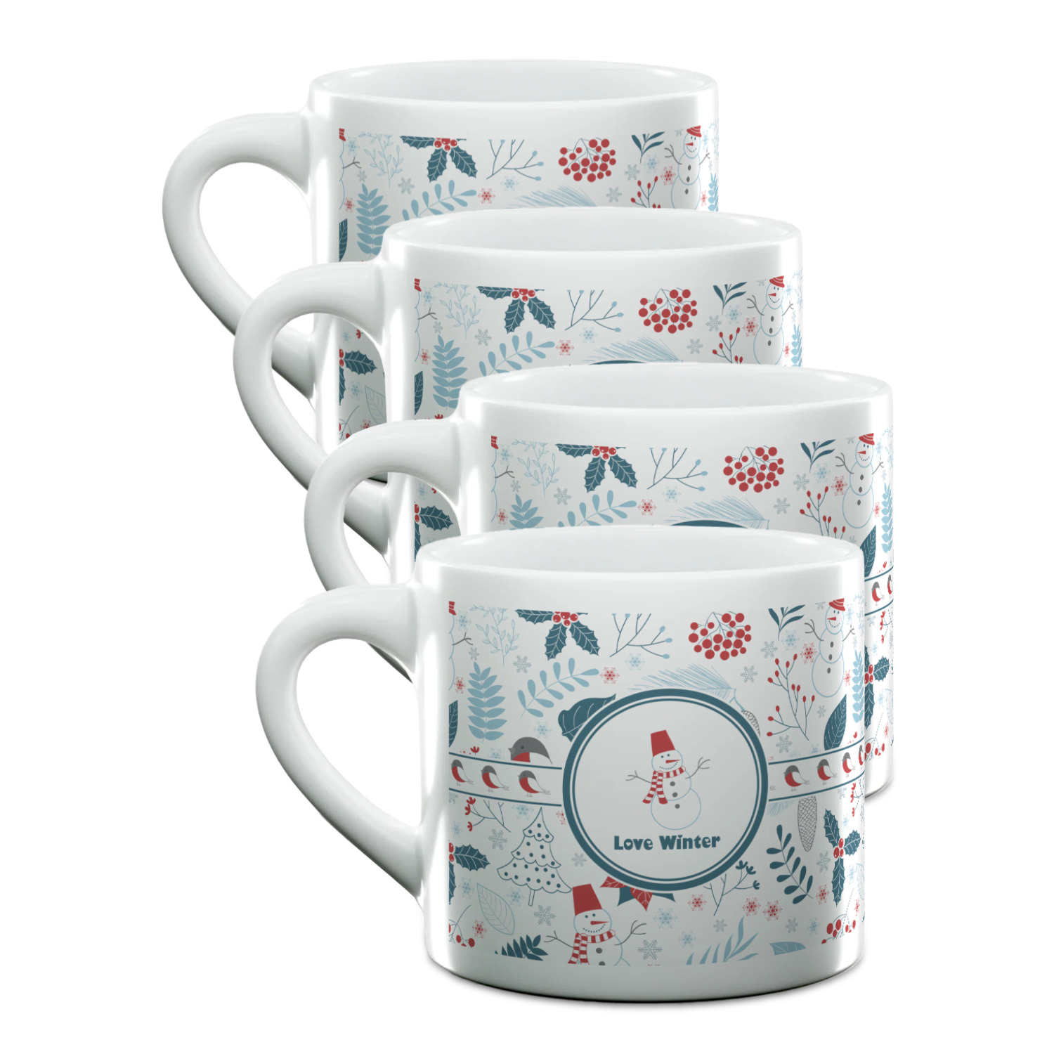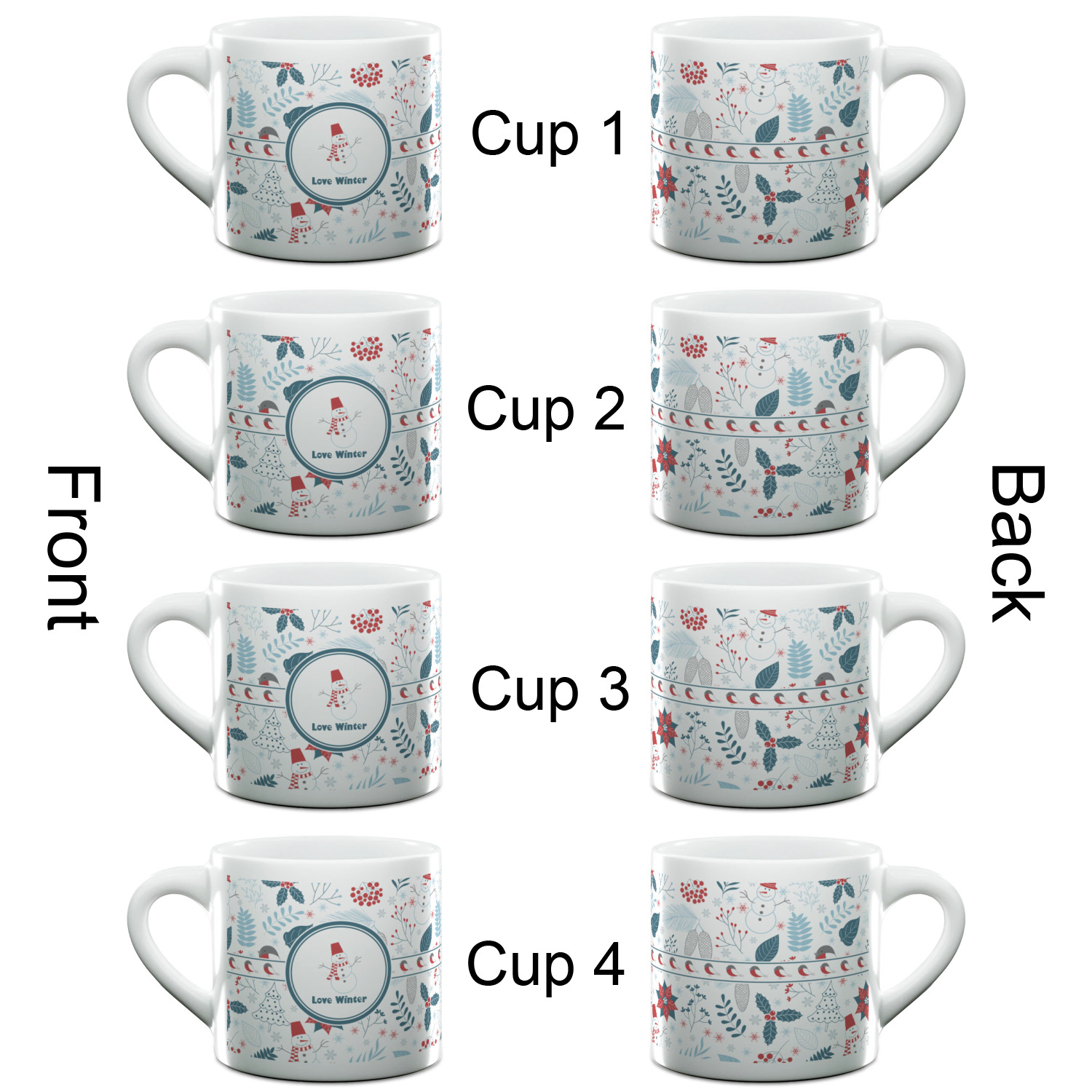 Each of our espresso mugs is a ceramic material sure to keep your drink warm. Personalize one cup for yourself, or order a set of 4! Its the perfect little gift for any coffee lover! We carry two sizes for you to personalize - 3 oz. (approx. 3.25" x 2.325" x 2.625") or 6 oz. (approx. 4" x 2.9" x 2.9"). Our 3 oz. mug is perfect for that single shot espresso while our 6 oz. mug can be your next favorite cappuccino cup holding two shots of espresso!