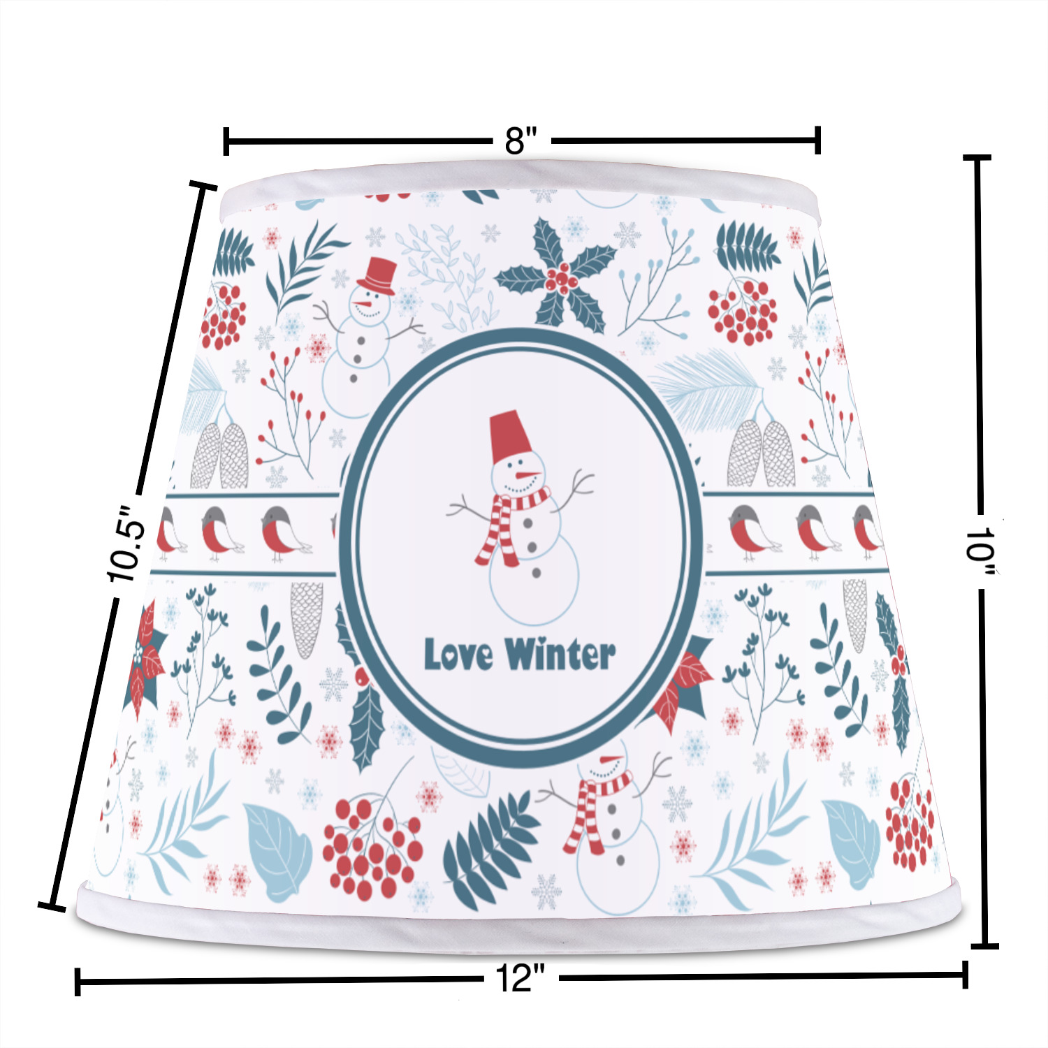 The base of this lampshade is 12 inches in diameter, and the top spans 8 inches in diameter. The total height of the lampshade is 10 inches. The angled nature of this custom lampshade concentrates the light, making it ideal for smaller spaces. This lampshade is made of matte, polyfilm, and displays your customization in its middle. The top and bottom of this colorful lamp shade are lined with a white fabric ribbon (which can be replaced with black inside the design studio) which frames your design and creates a sophisticated finish. As an UNO fitter lampshade, this unique lamp shade will fit a variety of bases.