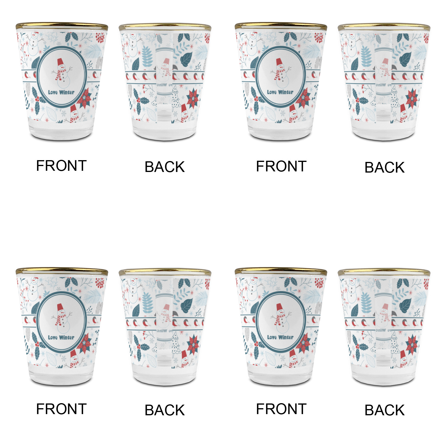 Made with frosted glass, these shot glasses are printed in full color with the design of your choice. They are a standard 1.5oz shot glass and are 2.4" tall. The print is wrapped around the shot glass in a full wrap and boldly displays your customization.