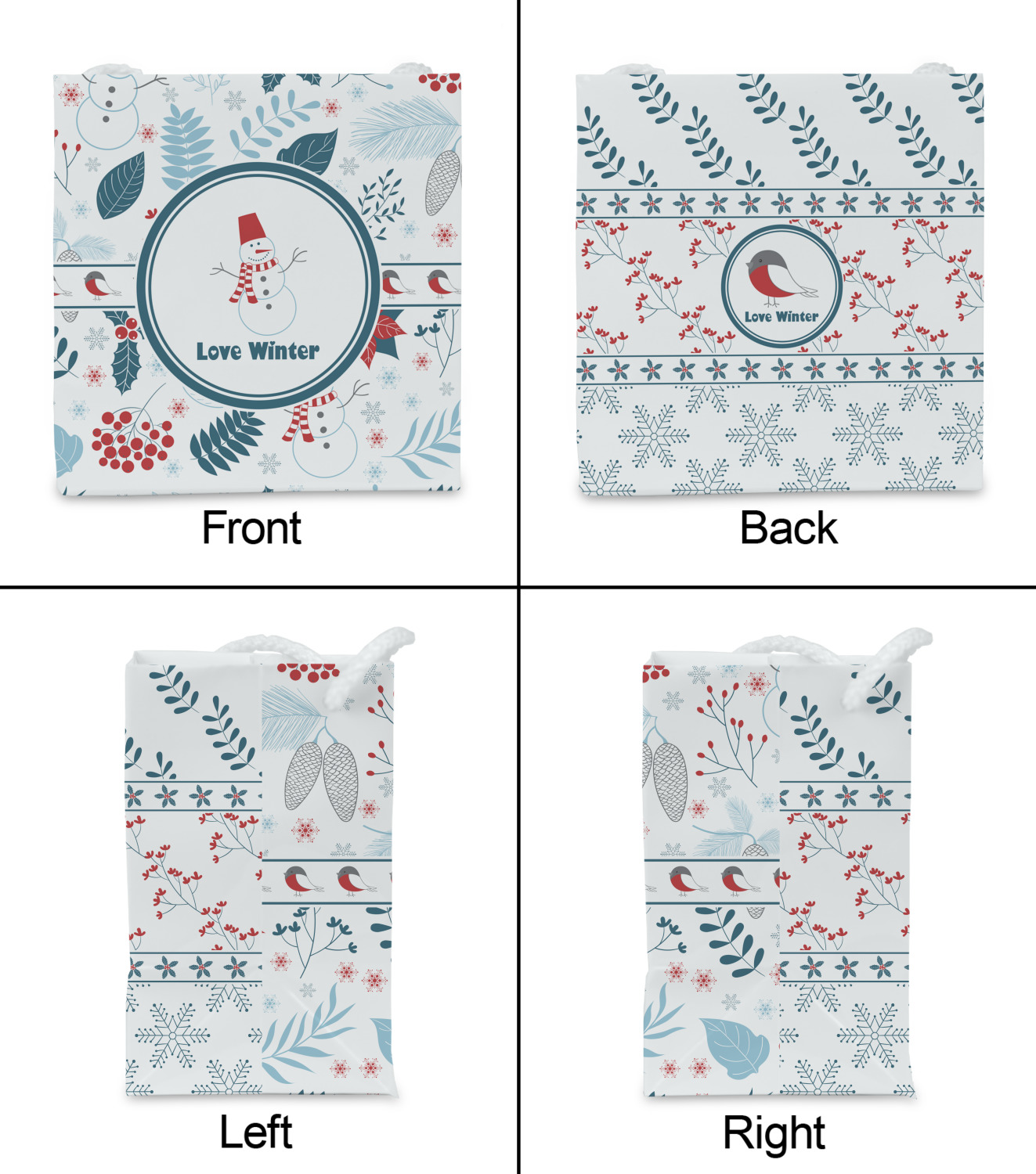 We chose a white ribbon with robins on the ribbon, a simple round label with a snowman and the words "Love Winter" for the personalization