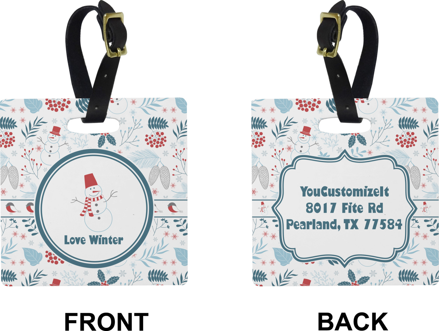 These personalized bag tags are sold in a variety of shapes, so that you may find the product that meets your vision exactly. We sell a round luggage tag, which measures at approximately 4" x 4". Our square luggage tag is about 3.5" x 3.5", while our rectangular version is 2.75" x 4 ".