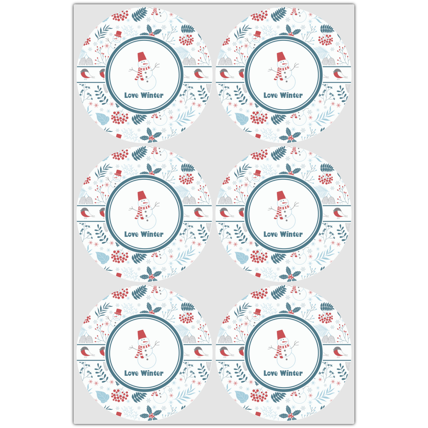 We chose a white ribbon with robins on the ribbon, a simple round label with a snowman and the words "Love Winter" for the personalization