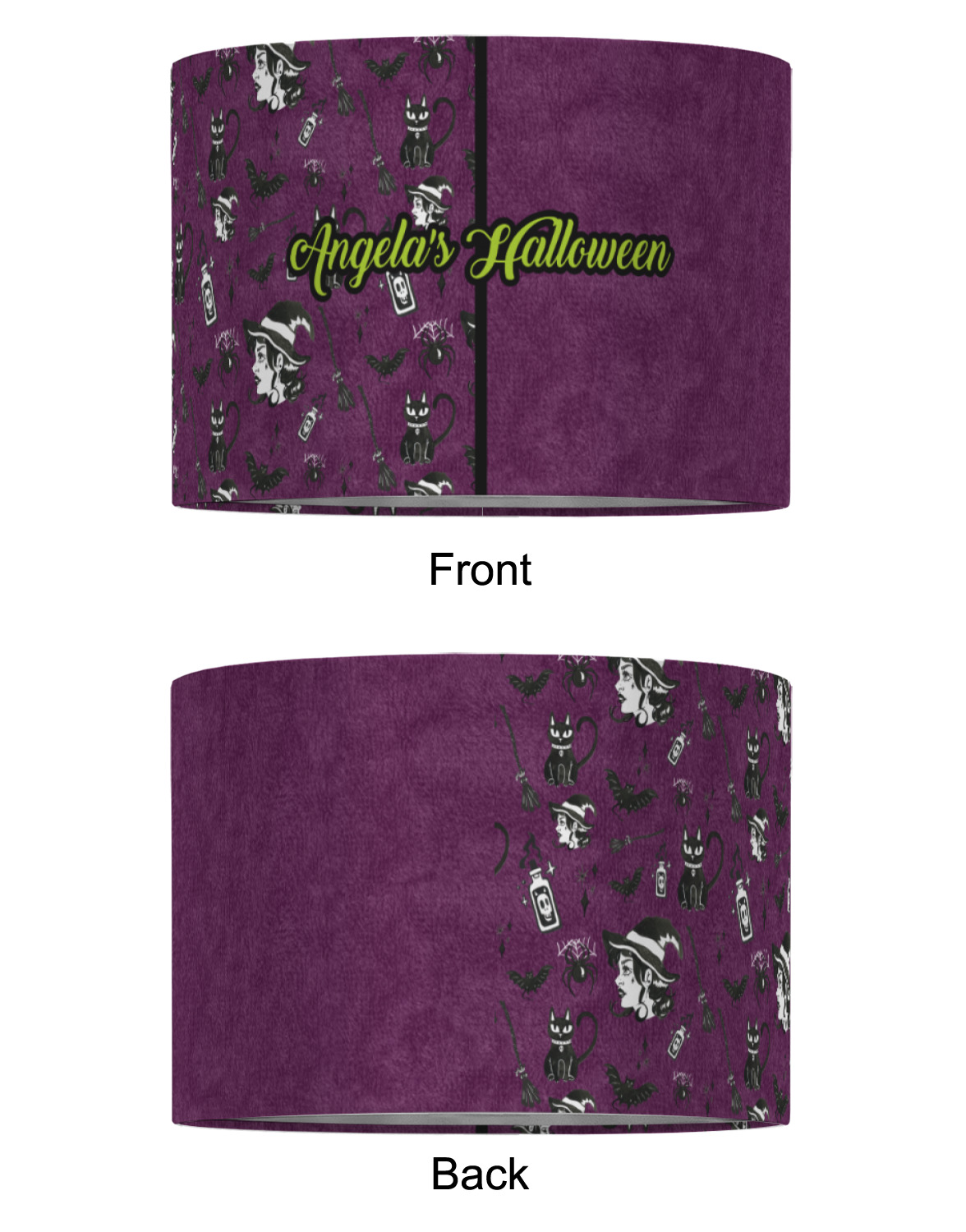 This fun design has a dark violet velvet looking (not real velvet - digital) background. On top of the digital velvet is a pattern full of beautiful illustrations of witches, potions, black cats, bats, and more. The main design is split in two with this background on one side and a plain violet digital velvet on the other. Your personalization is placed in the bottom right corner to give a lovely asymmetrical look. The coordinating design has a gorgeous large illustration of a witch with a little saying above and below her that says "I'll put a spell on you."