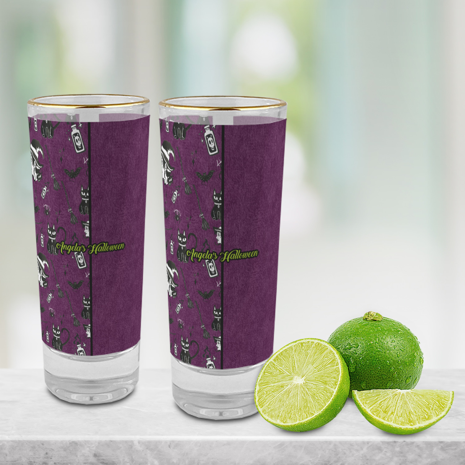 These glass shooter glasses are printed in full color with the design of your choice. These are a tall shooter 2 oz size and stand 4" tall. The print is a full wrap design to boldly display your personalization.