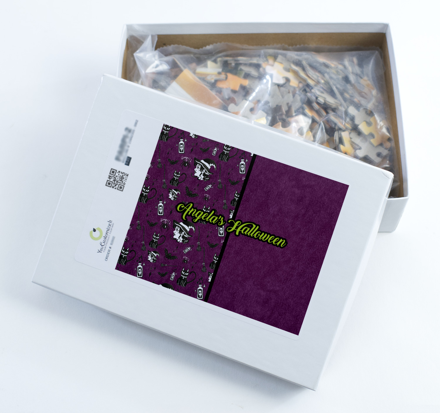 Depending on the look you are trying to achieve, you can add; a thematic pattern or background, with a photo in a frame and text or personalization to your puzzle. Basically if you can imagine it, you can design it!