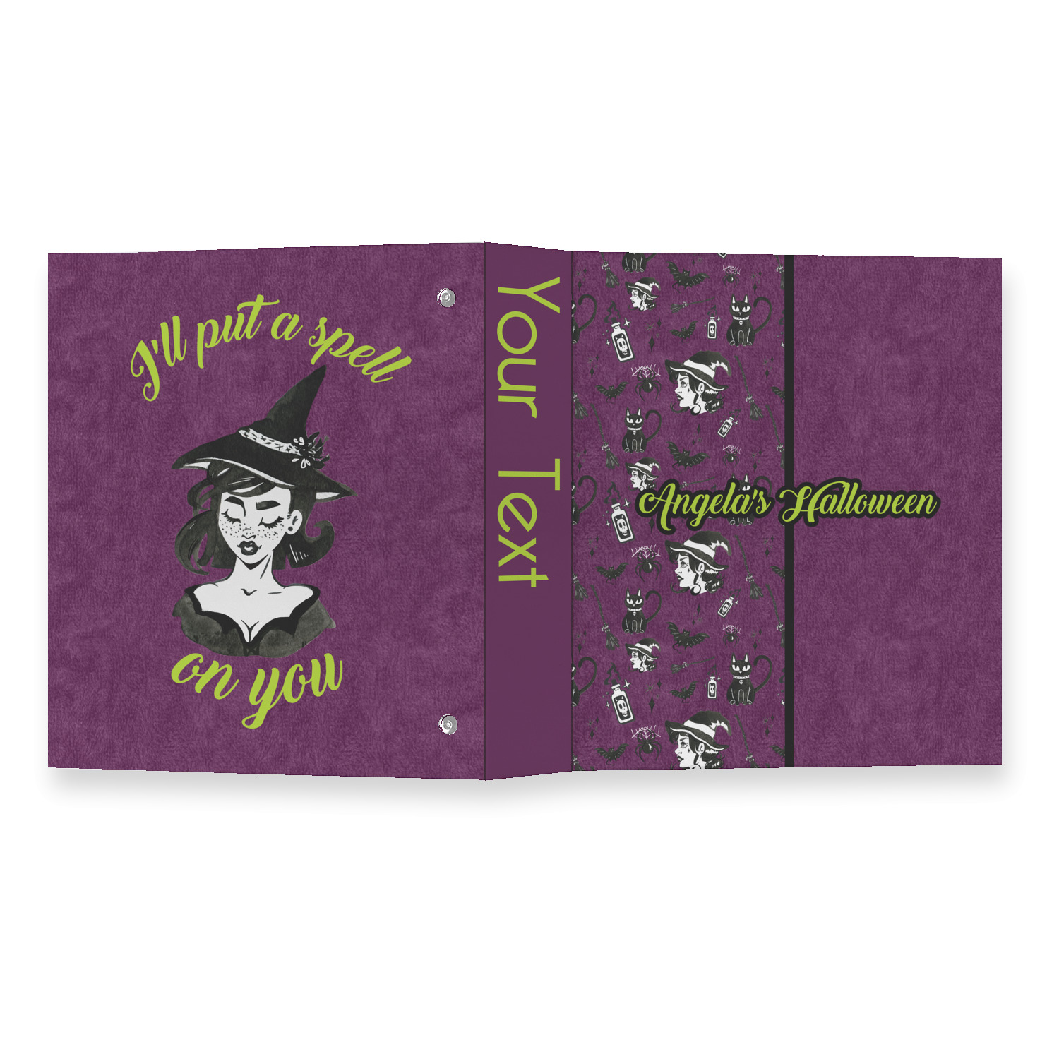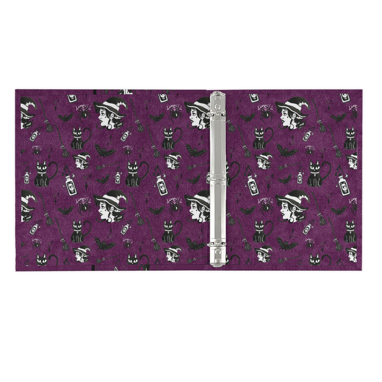 This fun design has a dark violet velvet looking (not real velvet - digital) background. On top of the digital velvet is a pattern full of beautiful illustrations of witches, potions, black cats, bats, and more. The main design is split in two with this background on one side and a plain violet digital velvet on the other. Your personalization is placed in the bottom right corner to give a lovely asymmetrical look. The coordinating design has a gorgeous large illustration of a witch with a little saying above and below her that says "I'll put a spell on you."