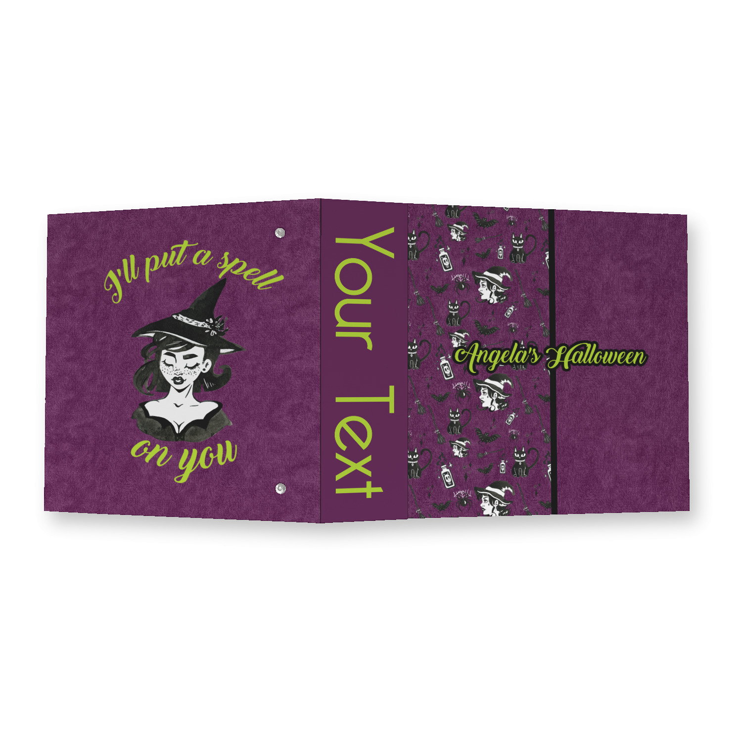 This fun design has a dark violet velvet looking (not real velvet - digital) background. On top of the digital velvet is a pattern full of beautiful illustrations of witches, potions, black cats, bats, and more. The main design is split in two with this background on one side and a plain violet digital velvet on the other. Your personalization is placed in the bottom right corner to give a lovely asymmetrical look. The coordinating design has a gorgeous large illustration of a witch with a little saying above and below her that says "I'll put a spell on you."