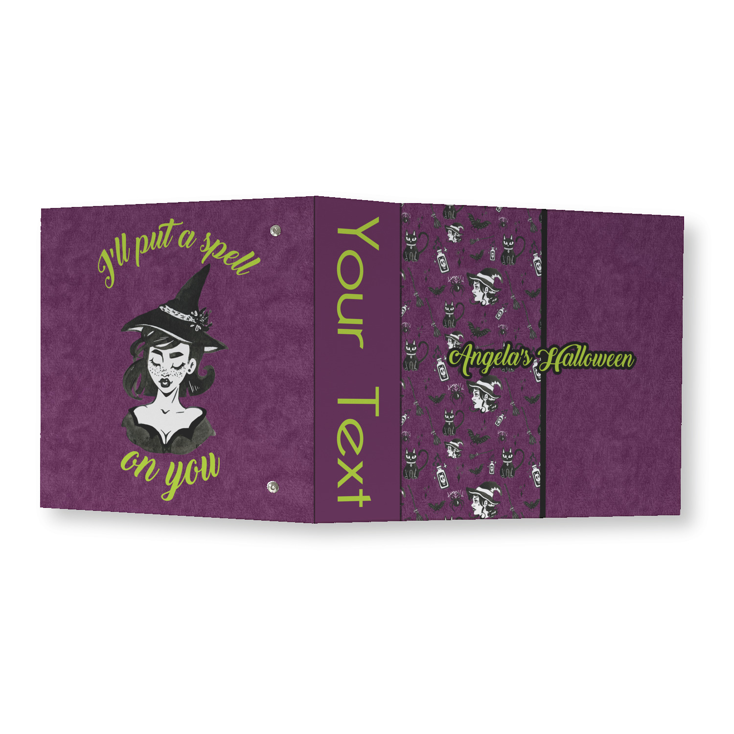 This fun design has a dark violet velvet looking (not real velvet - digital) background. On top of the digital velvet is a pattern full of beautiful illustrations of witches, potions, black cats, bats, and more. The main design is split in two with this background on one side and a plain violet digital velvet on the other. Your personalization is placed in the bottom right corner to give a lovely asymmetrical look. The coordinating design has a gorgeous large illustration of a witch with a little saying above and below her that says "I'll put a spell on you."