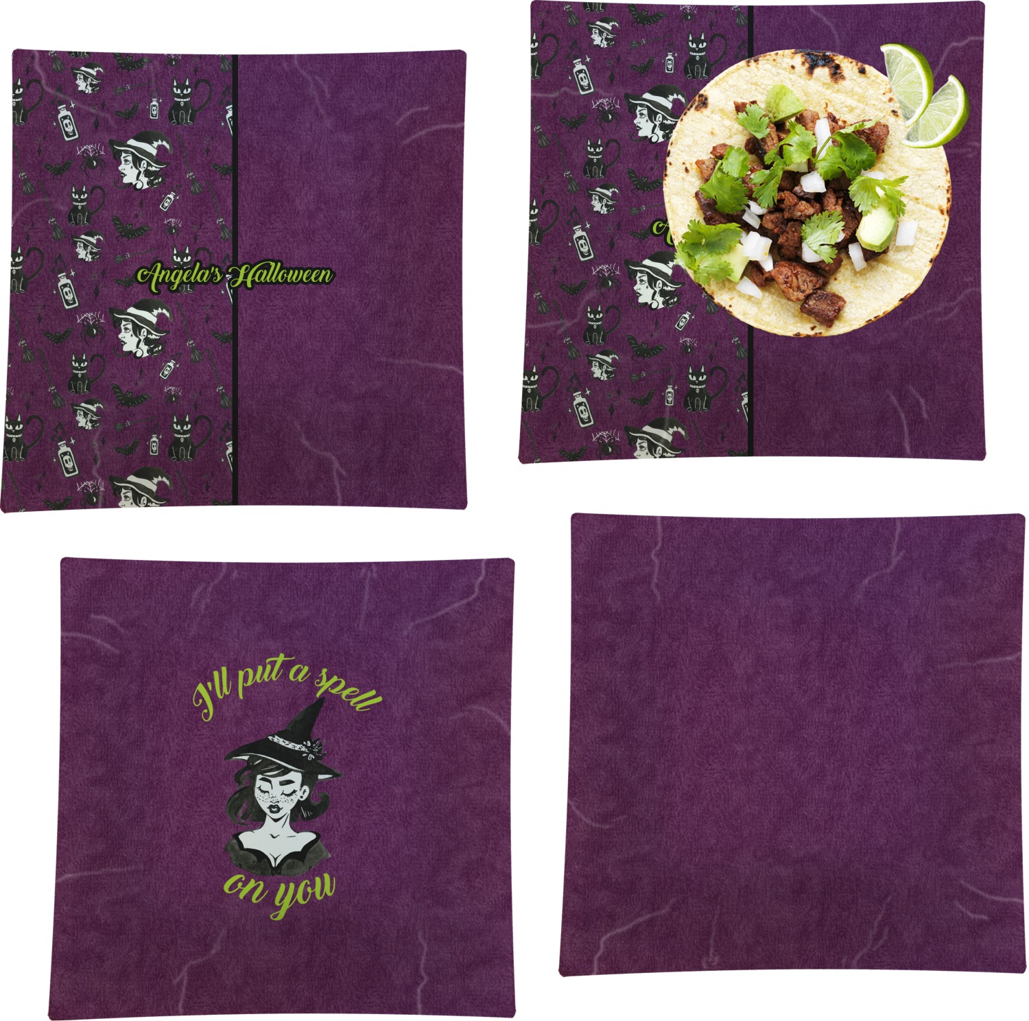 This fun design has a dark violet velvet looking (not real velvet - digital) background. On top of the digital velvet is a pattern full of beautiful illustrations of witches, potions, black cats, bats, and more. The main design is split in two with this background on one side and a plain violet digital velvet on the other. Your personalization is placed in the bottom right corner to give a lovely asymmetrical look. The coordinating design has a gorgeous large illustration of a witch with a little saying above and below her that says "I'll put a spell on you."