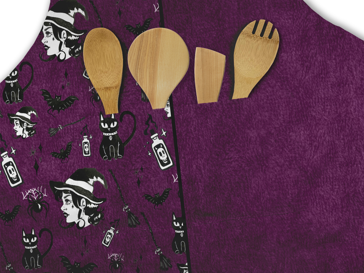 Our aprons are a lightweight yet durable polyester material. We offer two styles of aprons, one without pockets and one with two pockets adorning the center near the waistline. Each apron is one size* and comes with adjustable straps for both the neckline and waist. We print your custom design on the front of the apron to display your creativity!