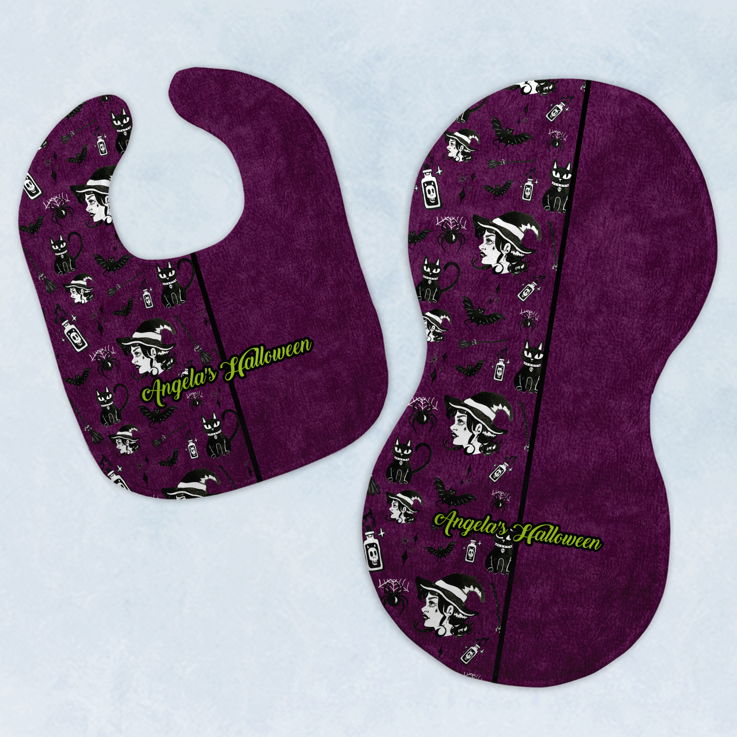 This fun design has a dark violet velvet looking (not real velvet - digital) background. On top of the digital velvet is a pattern full of beautiful illustrations of witches, potions, black cats, bats, and more. The main design is split in two with this background on one side and a plain violet digital velvet on the other. Your personalization is placed in the bottom right corner to give a lovely asymmetrical look. The coordinating design has a gorgeous large illustration of a witch with a little saying above and below her that says "I'll put a spell on you."