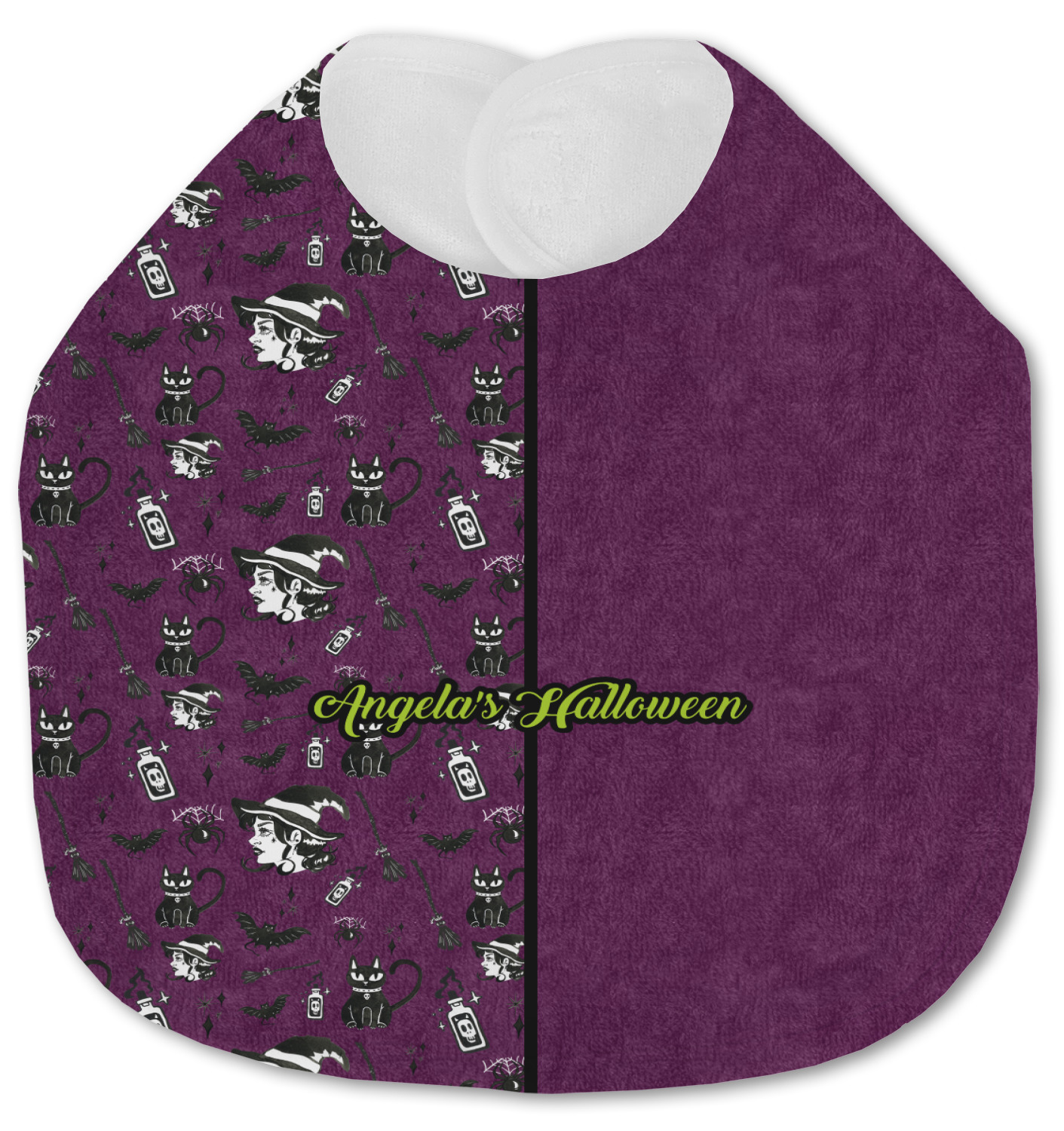 This fun design has a dark violet velvet looking (not real velvet - digital) background. On top of the digital velvet is a pattern full of beautiful illustrations of witches, potions, black cats, bats, and more. The main design is split in two with this background on one side and a plain violet digital velvet on the other. Your personalization is placed in the bottom right corner to give a lovely asymmetrical look. The coordinating design has a gorgeous large illustration of a witch with a little saying above and below her that says "I'll put a spell on you."