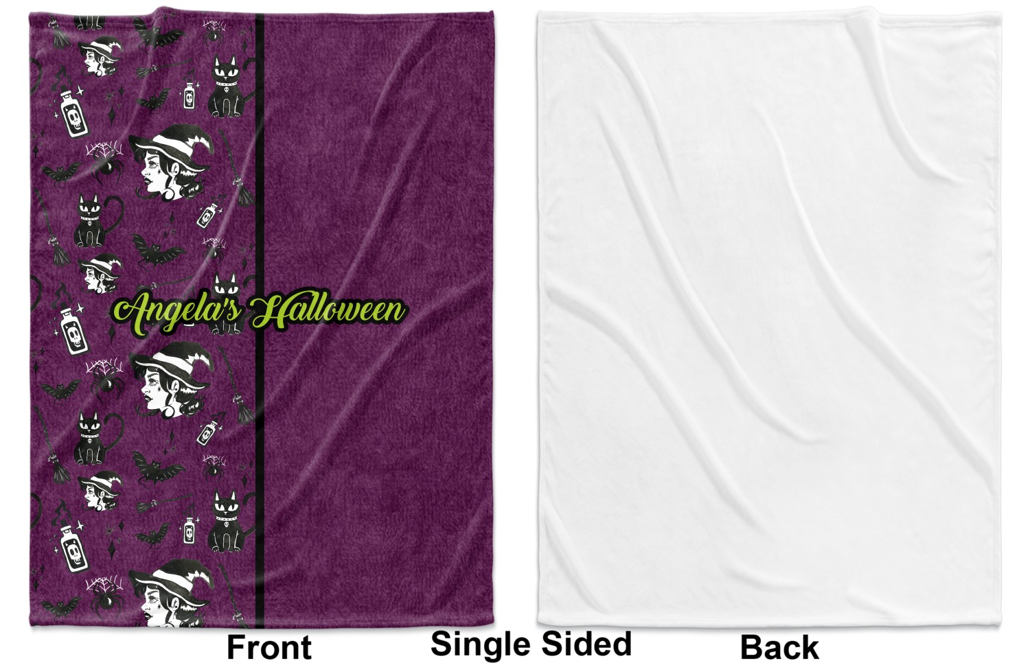 This fun design has a dark violet velvet looking (not real velvet - digital) background. On top of the digital velvet is a pattern full of beautiful illustrations of witches, potions, black cats, bats, and more. The main design is split in two with this background on one side and a plain violet digital velvet on the other. Your personalization is placed in the bottom right corner to give a lovely asymmetrical look. The coordinating design has a gorgeous large illustration of a witch with a little saying above and below her that says "I'll put a spell on you."