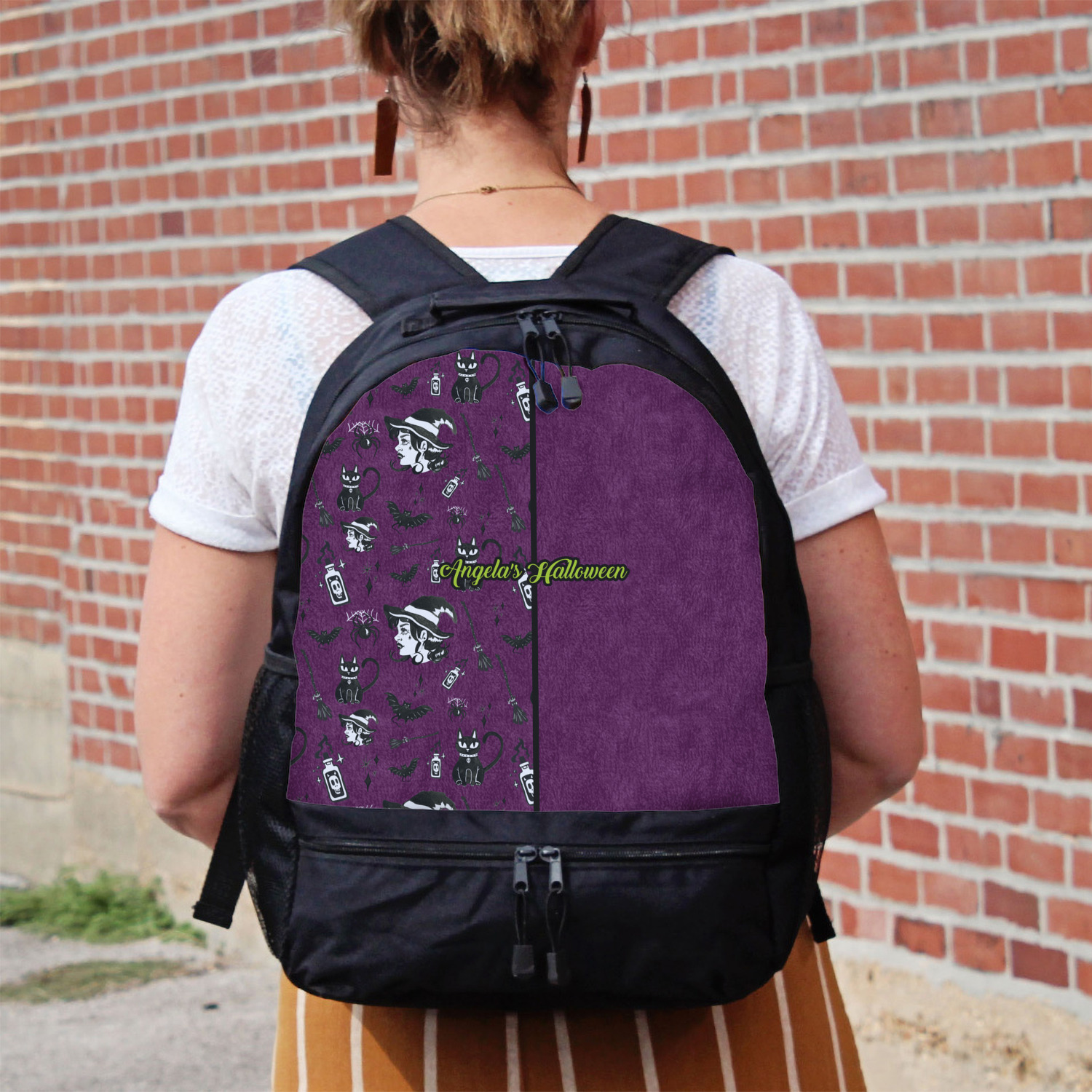 This fun design has a dark violet velvet looking (not real velvet - digital) background. On top of the digital velvet is a pattern full of beautiful illustrations of witches, potions, black cats, bats, and more. The main design is split in two with this background on one side and a plain violet digital velvet on the other. Your personalization is placed in the bottom right corner to give a lovely asymmetrical look. The coordinating design has a gorgeous large illustration of a witch with a little saying above and below her that says "I'll put a spell on you."