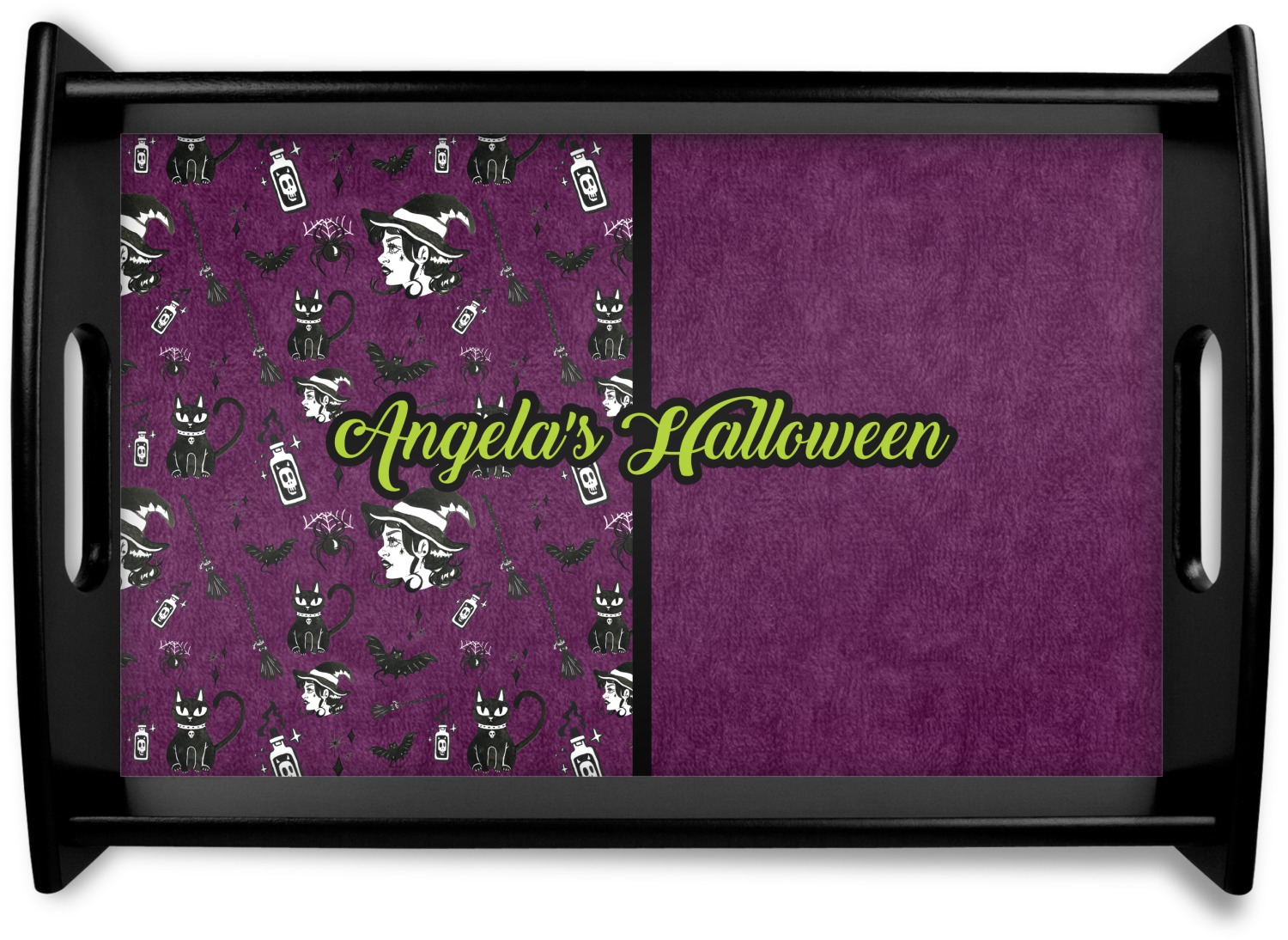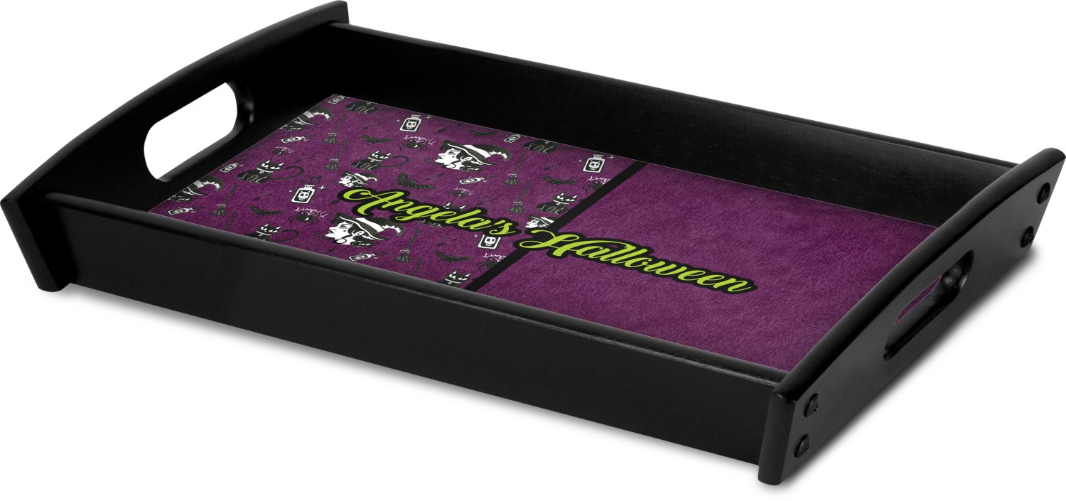 This serving tray with handles features square edges and two rounded sides, creating a very modern look. Each side is fabricated from a beautifully cut, natural wood. The bottom of the interior of the tray displays your customized design in bright, vibrant color. The tray is sold in both a black color and a natural wood look. Each variation of the wood serving tray has two sizes: Small, which is 14" x 10" x 2.25", and Large, which is 19.5" x 13.5" x 2.75".