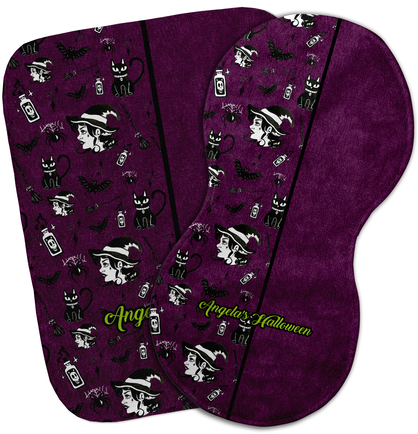 This fun design has a dark violet velvet looking (not real velvet - digital) background. On top of the digital velvet is a pattern full of beautiful illustrations of witches, potions, black cats, bats, and more. The main design is split in two with this background on one side and a plain violet digital velvet on the other. Your personalization is placed in the bottom right corner to give a lovely asymmetrical look. The coordinating design has a gorgeous large illustration of a witch with a little saying above and below her that says "I'll put a spell on you."