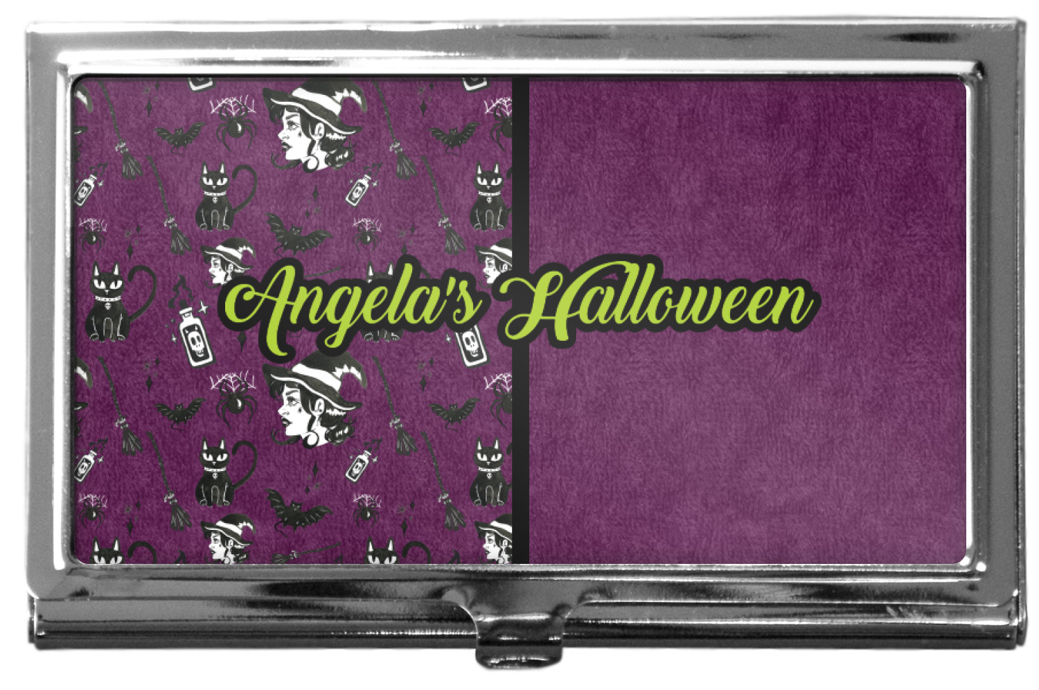 This fun design has a dark violet velvet looking (not real velvet - digital) background. On top of the digital velvet is a pattern full of beautiful illustrations of witches, potions, black cats, bats, and more. The main design is split in two with this background on one side and a plain violet digital velvet on the other. Your personalization is placed in the bottom right corner to give a lovely asymmetrical look. The coordinating design has a gorgeous large illustration of a witch with a little saying above and below her that says "I'll put a spell on you."