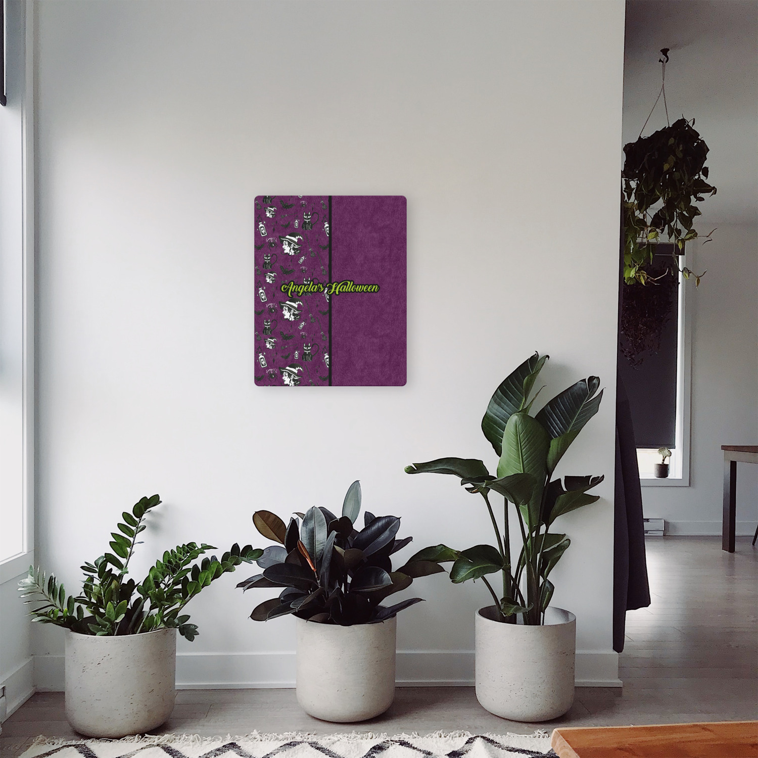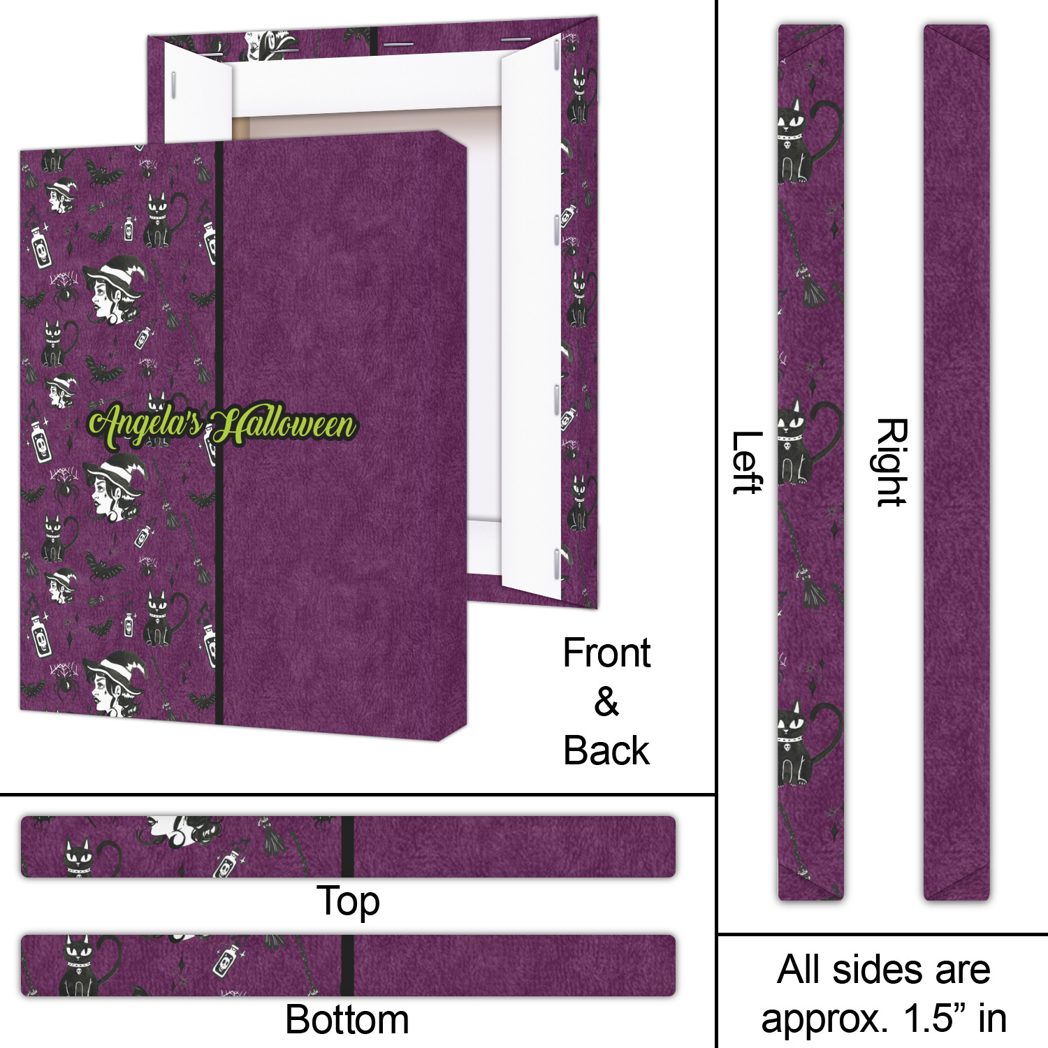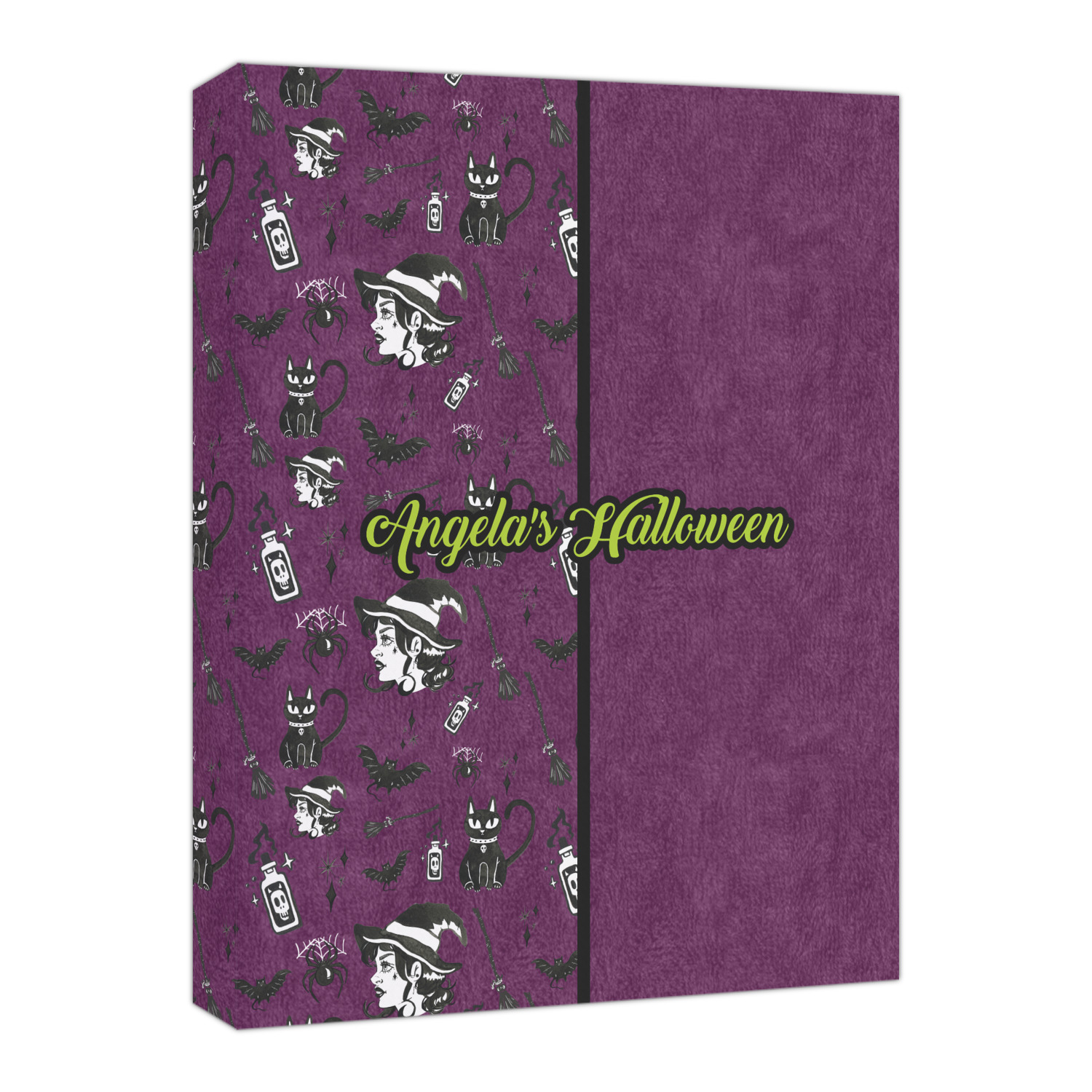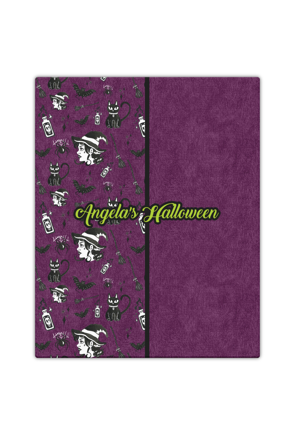 This fun design has a dark violet velvet looking (not real velvet - digital) background. On top of the digital velvet is a pattern full of beautiful illustrations of witches, potions, black cats, bats, and more. The main design is split in two with this background on one side and a plain violet digital velvet on the other. Your personalization is placed in the bottom right corner to give a lovely asymmetrical look. The coordinating design has a gorgeous large illustration of a witch with a little saying above and below her that says "I'll put a spell on you."