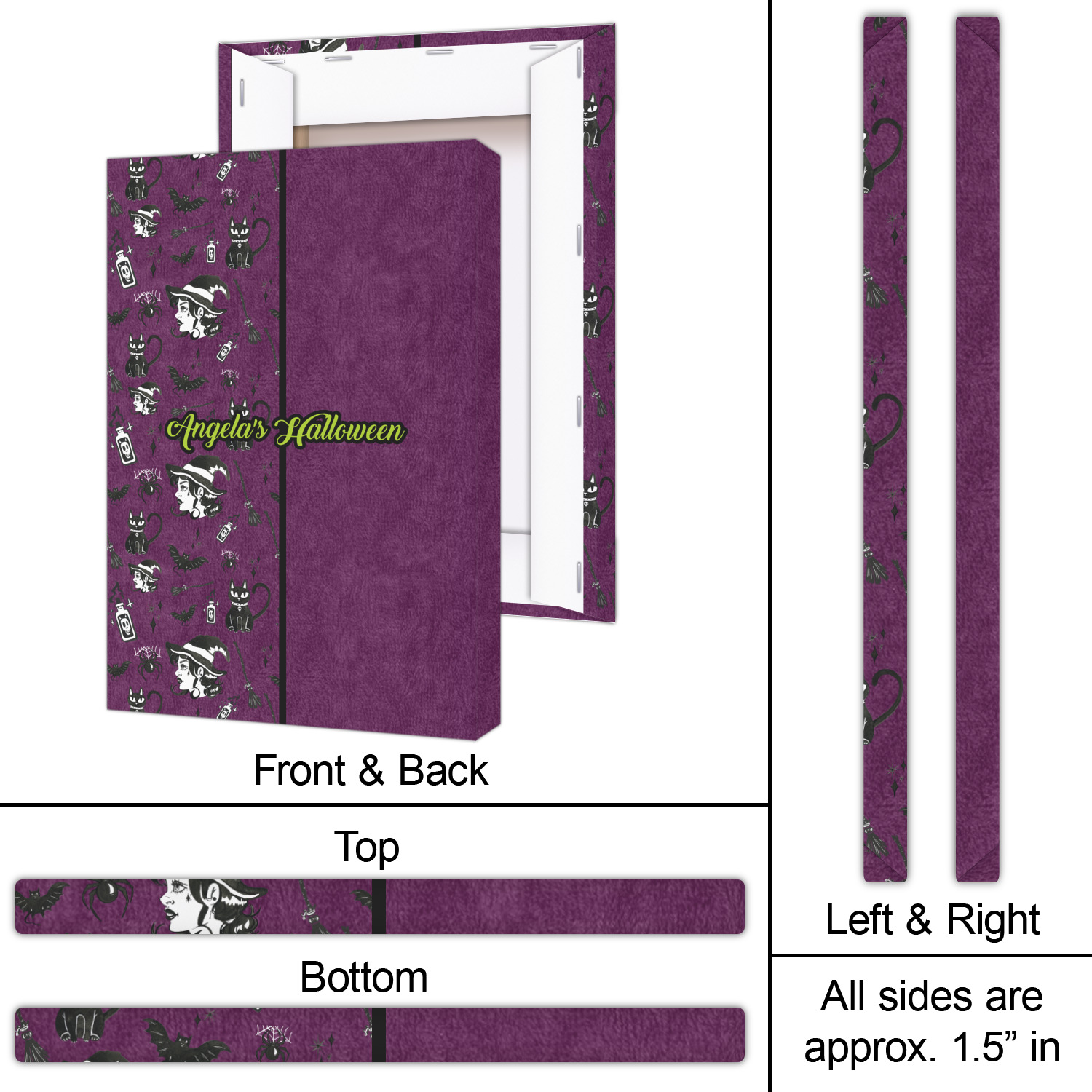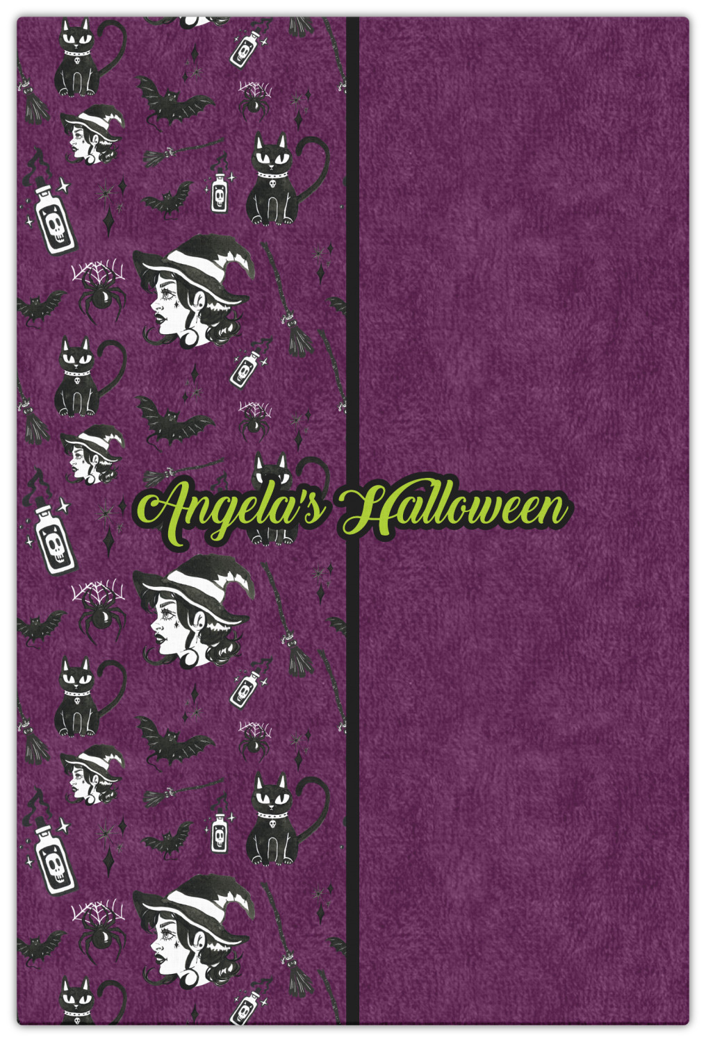 This fun design has a dark violet velvet looking (not real velvet - digital) background. On top of the digital velvet is a pattern full of beautiful illustrations of witches, potions, black cats, bats, and more. The main design is split in two with this background on one side and a plain violet digital velvet on the other. Your personalization is placed in the bottom right corner to give a lovely asymmetrical look. The coordinating design has a gorgeous large illustration of a witch with a little saying above and below her that says "I'll put a spell on you."