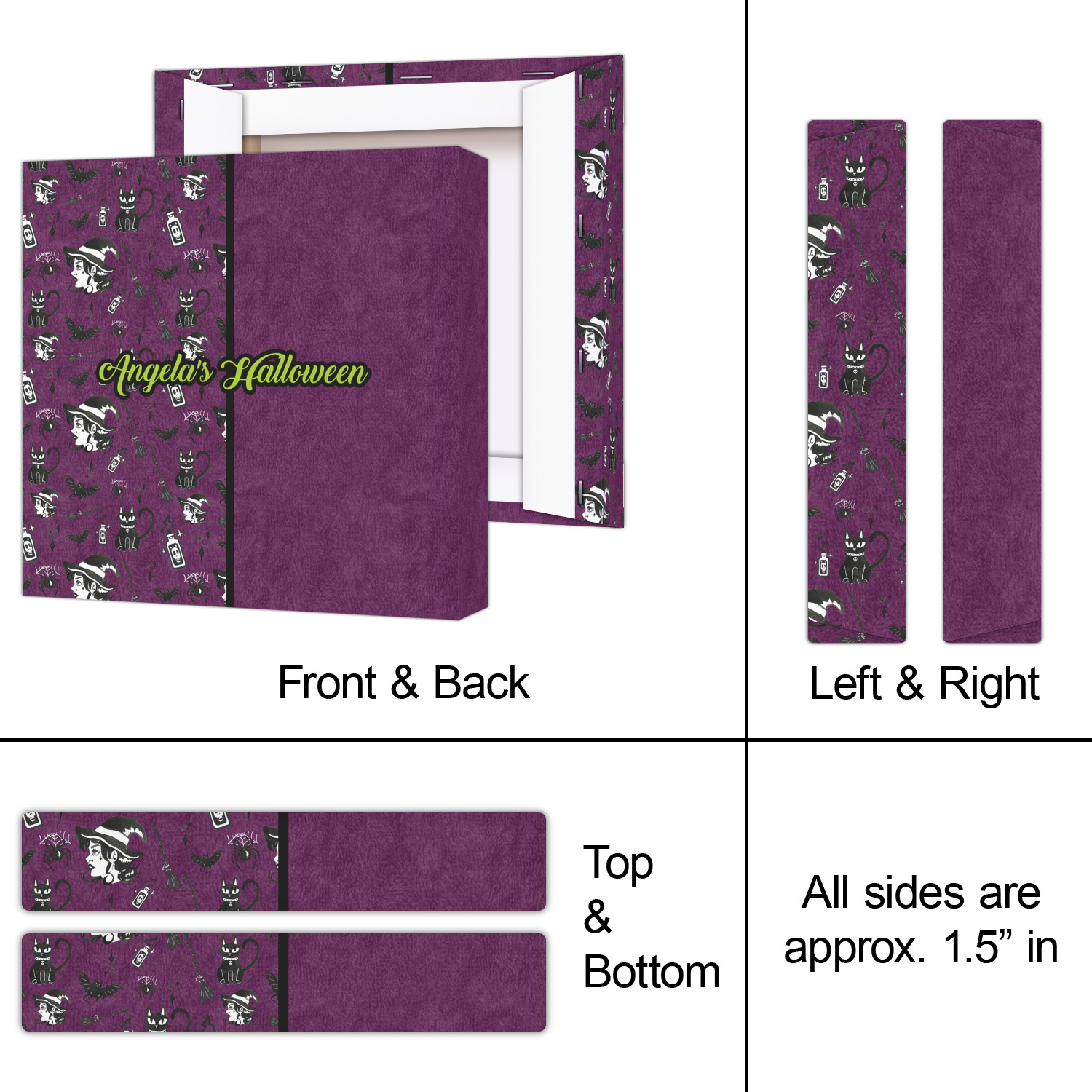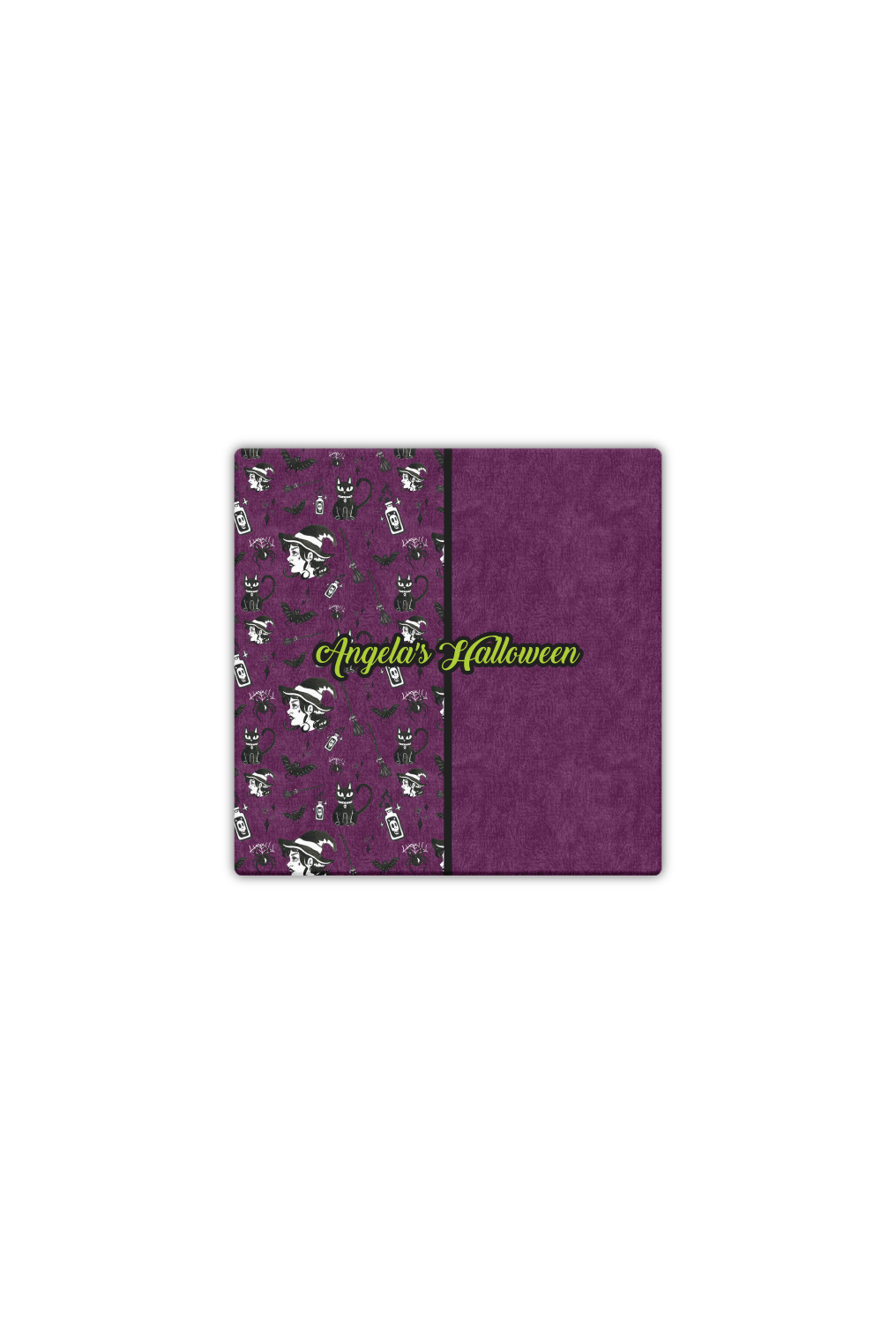 This fun design has a dark violet velvet looking (not real velvet - digital) background. On top of the digital velvet is a pattern full of beautiful illustrations of witches, potions, black cats, bats, and more. The main design is split in two with this background on one side and a plain violet digital velvet on the other. Your personalization is placed in the bottom right corner to give a lovely asymmetrical look. The coordinating design has a gorgeous large illustration of a witch with a little saying above and below her that says "I'll put a spell on you."