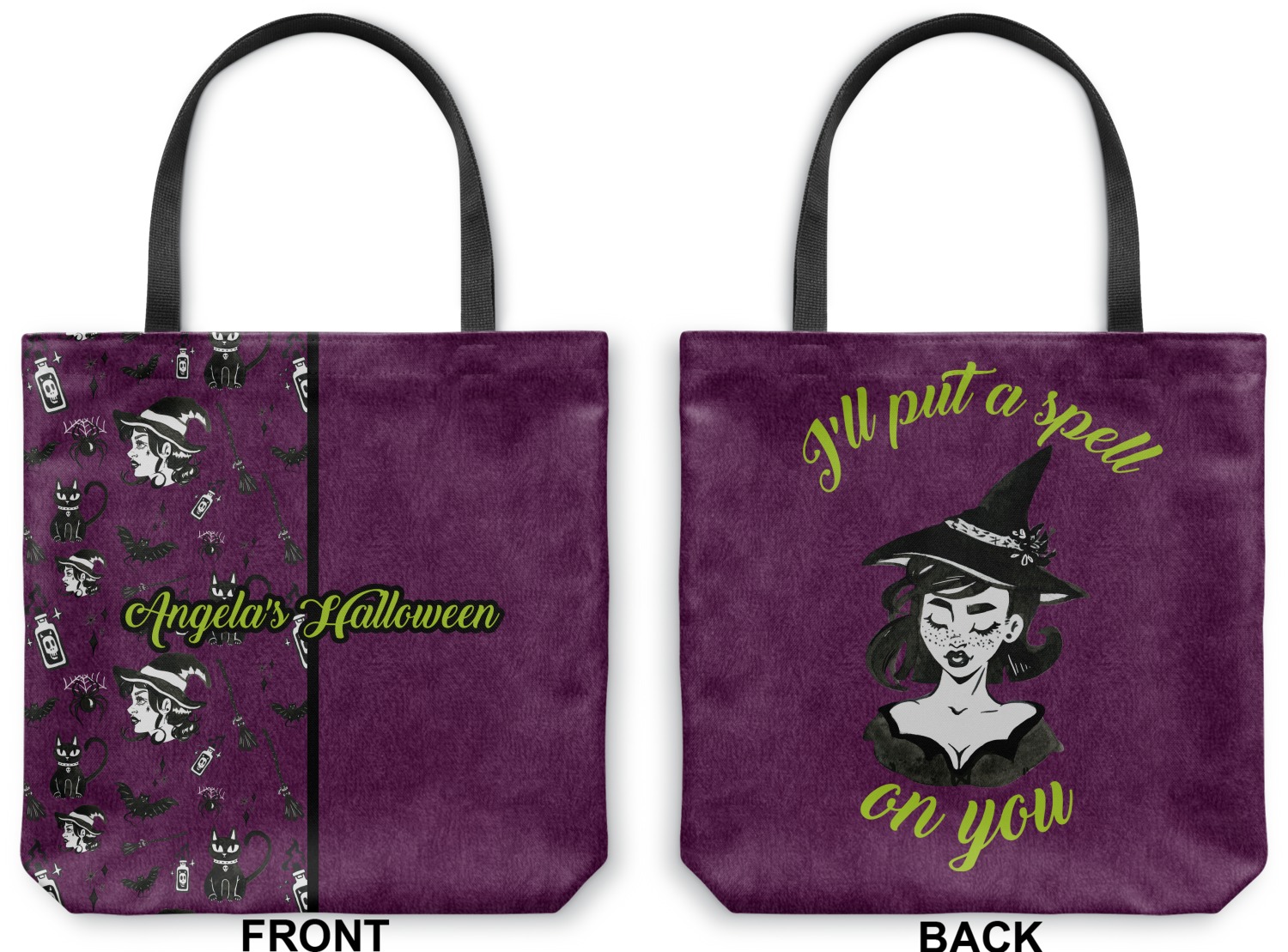 This fun design has a dark violet velvet looking (not real velvet - digital) background. On top of the digital velvet is a pattern full of beautiful illustrations of witches, potions, black cats, bats, and more. The main design is split in two with this background on one side and a plain violet digital velvet on the other. Your personalization is placed in the bottom right corner to give a lovely asymmetrical look. The coordinating design has a gorgeous large illustration of a witch with a little saying above and below her that says "I'll put a spell on you."
