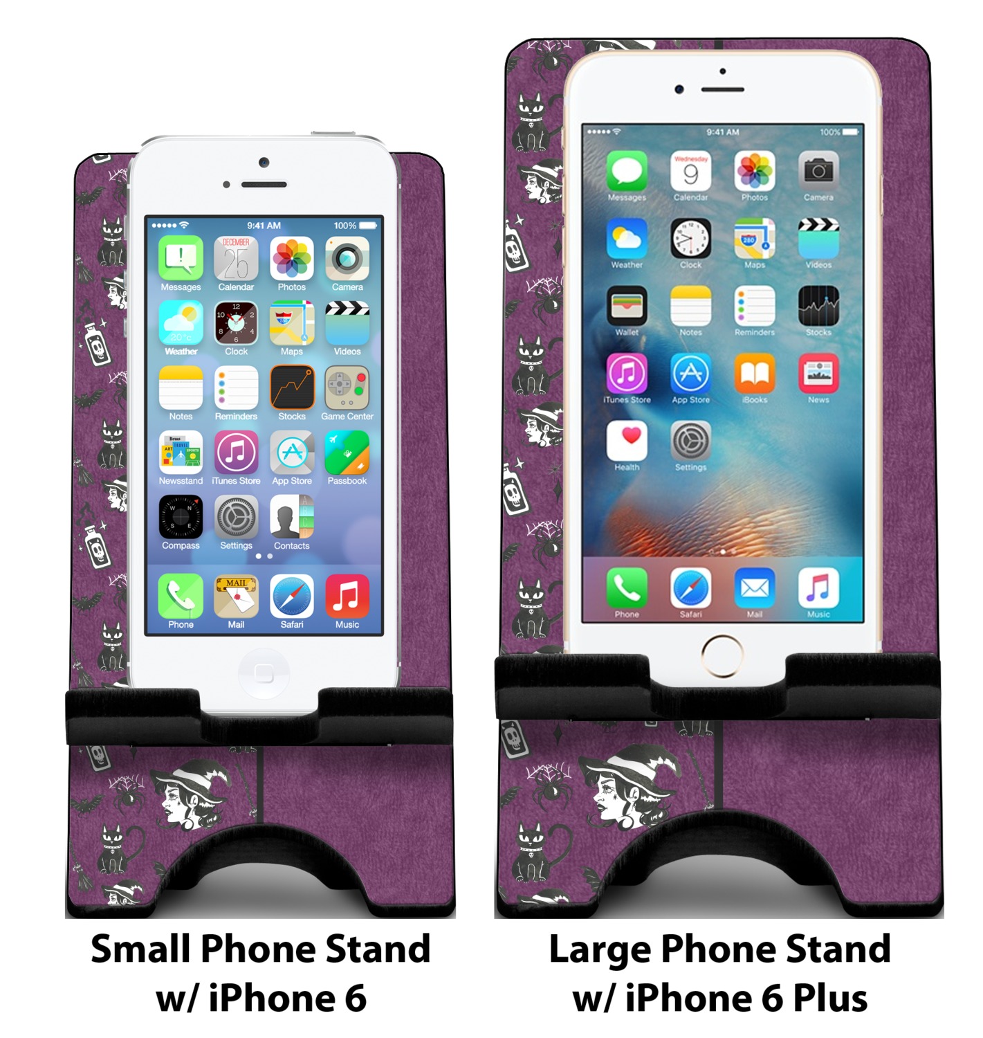 To meet your needs, we offer four variations of this IPhone stand. The backboard of the first version is shaped as a plain, yet sleek rectangle, and is available in two sizes. Our smaller size is approximately 4 by 3.25 by 7 inches, while the larger model is 4 by 3.77 by 8.5 inches. Alongside this model, we also provide you with a more decorative option. The upper part of our second version features a curved edge, for a classy, suave appearance. This phone holder is also sold in two sizes: a smaller version, which is 4 by 3.25 by 7 inches, and our larger model, which is 4 by 3.77 by 8.5 inches. Both models will support large phones, but the larger model is better if you wish to proudly display your personalized design.