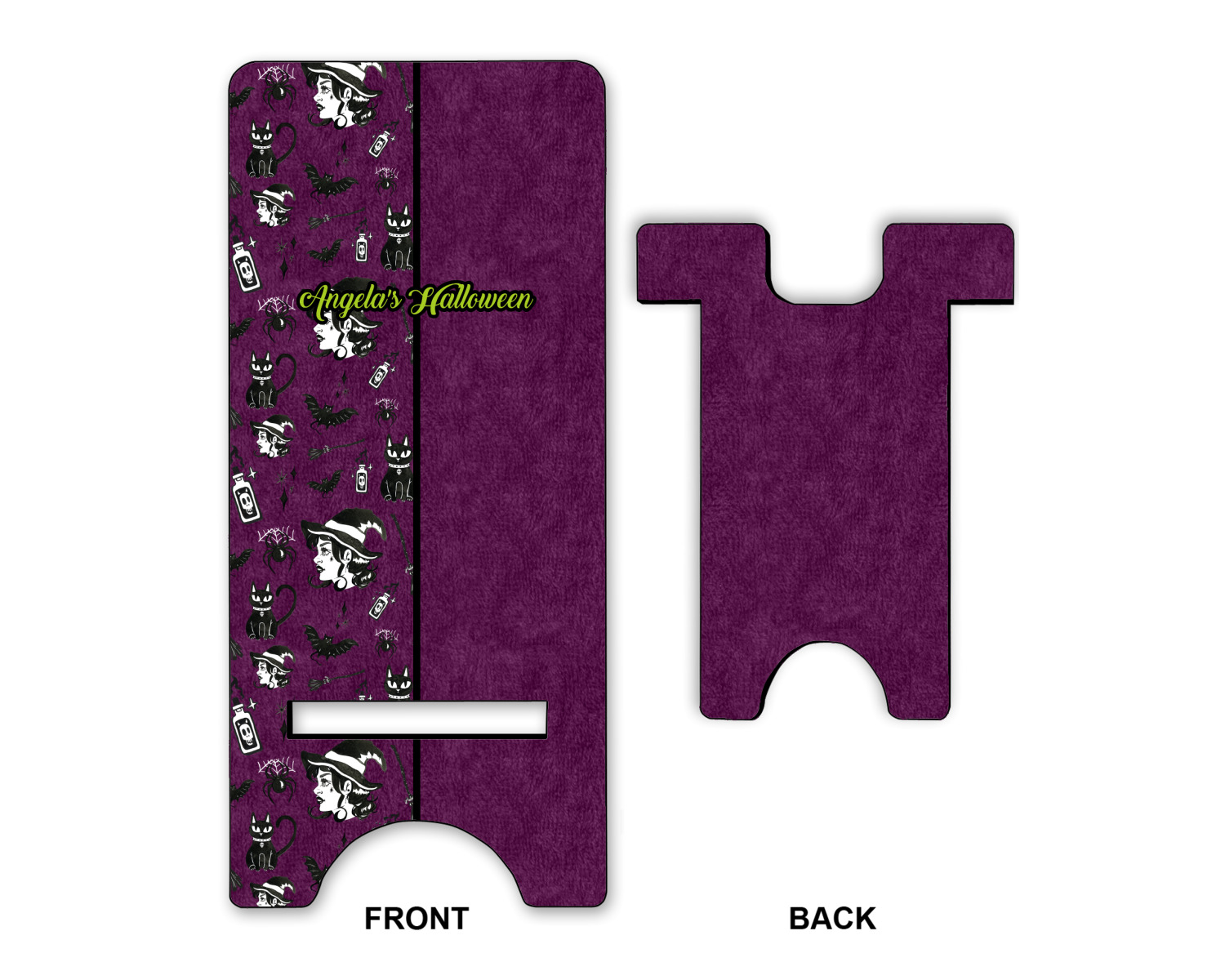 This fun design has a dark violet velvet looking (not real velvet - digital) background. On top of the digital velvet is a pattern full of beautiful illustrations of witches, potions, black cats, bats, and more. The main design is split in two with this background on one side and a plain violet digital velvet on the other. Your personalization is placed in the bottom right corner to give a lovely asymmetrical look. The coordinating design has a gorgeous large illustration of a witch with a little saying above and below her that says "I'll put a spell on you."