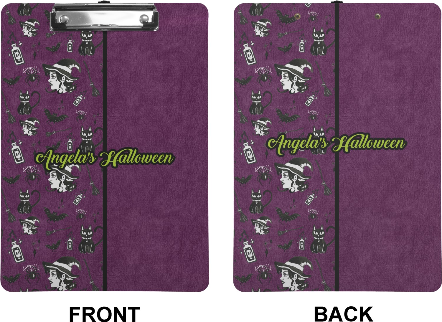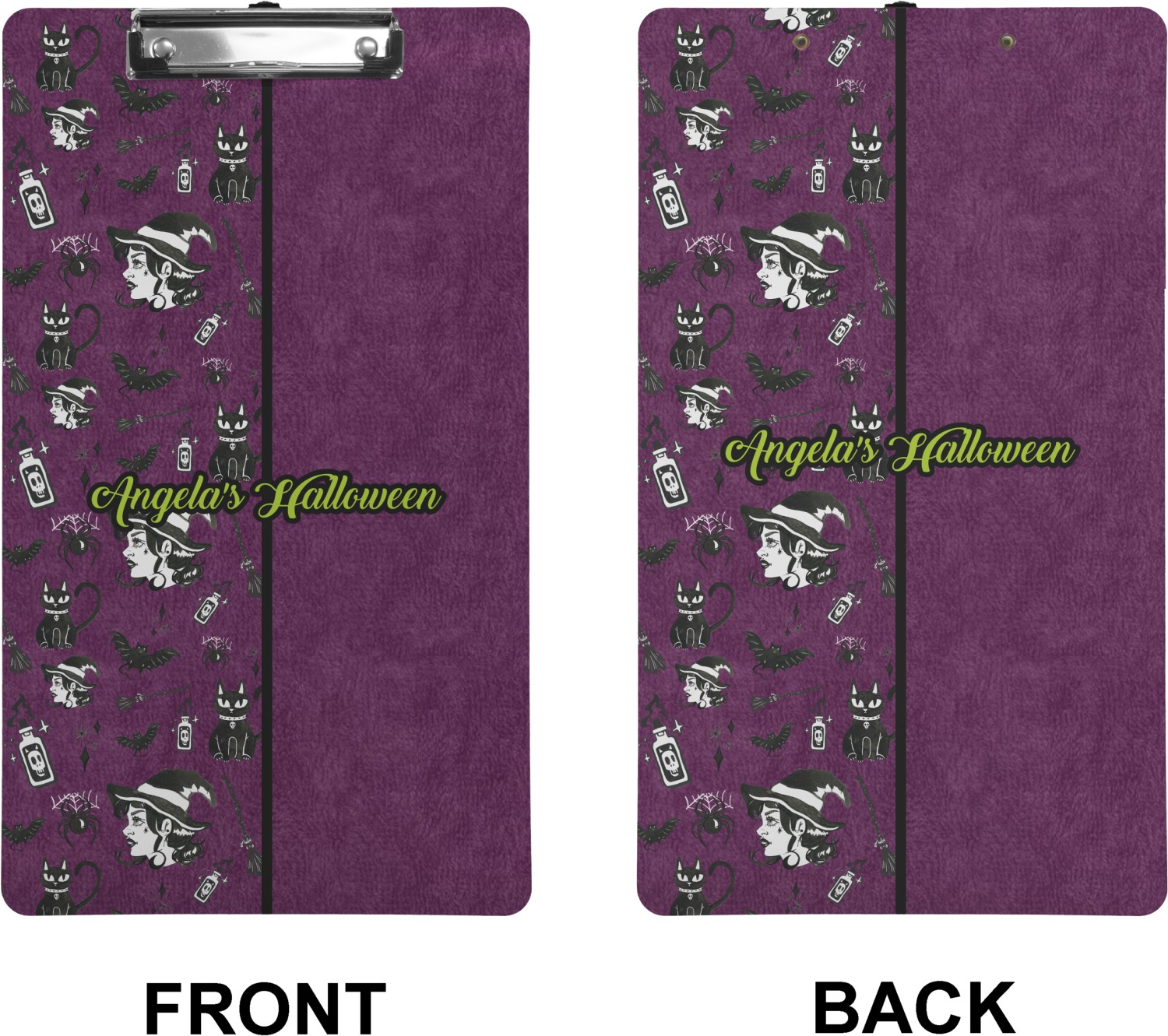This fun design has a dark violet velvet looking (not real velvet - digital) background. On top of the digital velvet is a pattern full of beautiful illustrations of witches, potions, black cats, bats, and more. The main design is split in two with this background on one side and a plain violet digital velvet on the other. Your personalization is placed in the bottom right corner to give a lovely asymmetrical look. The coordinating design has a gorgeous large illustration of a witch with a little saying above and below her that says "I'll put a spell on you."