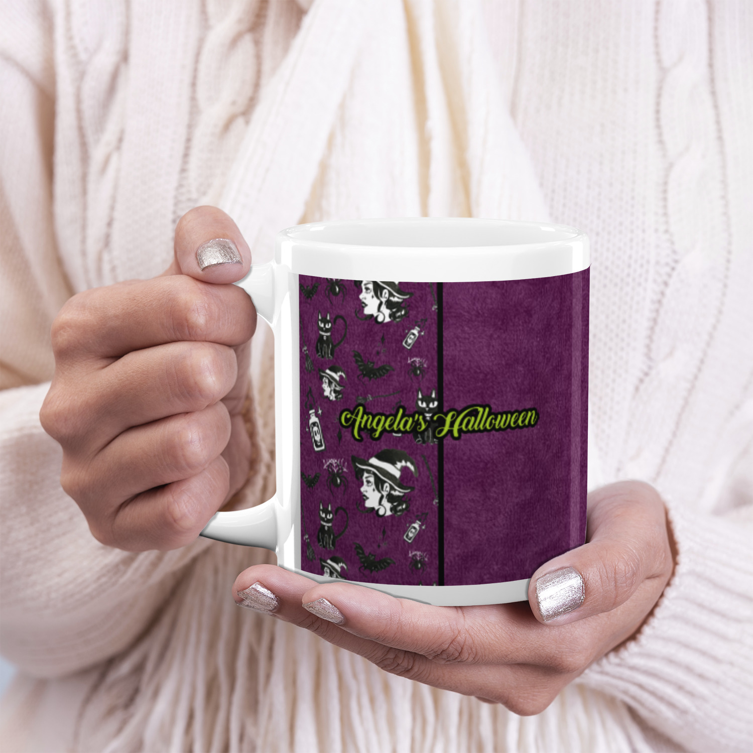 This fun design has a dark violet velvet looking (not real velvet - digital) background. On top of the digital velvet is a pattern full of beautiful illustrations of witches, potions, black cats, bats, and more. The main design is split in two with this background on one side and a plain violet digital velvet on the other. Your personalization is placed in the bottom right corner to give a lovely asymmetrical look. The coordinating design has a gorgeous large illustration of a witch with a little saying above and below her that says "I'll put a spell on you."