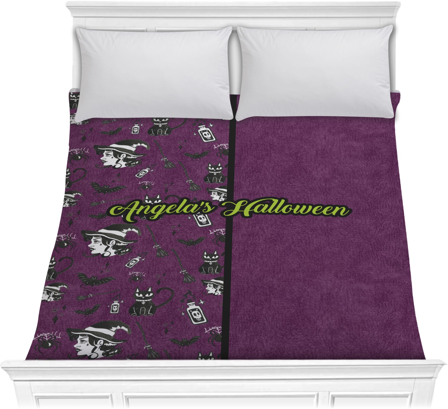 This fun design has a dark violet velvet looking (not real velvet - digital) background. On top of the digital velvet is a pattern full of beautiful illustrations of witches, potions, black cats, bats, and more. The main design is split in two with this background on one side and a plain violet digital velvet on the other. Your personalization is placed in the bottom right corner to give a lovely asymmetrical look. The coordinating design has a gorgeous large illustration of a witch with a little saying above and below her that says "I'll put a spell on you."