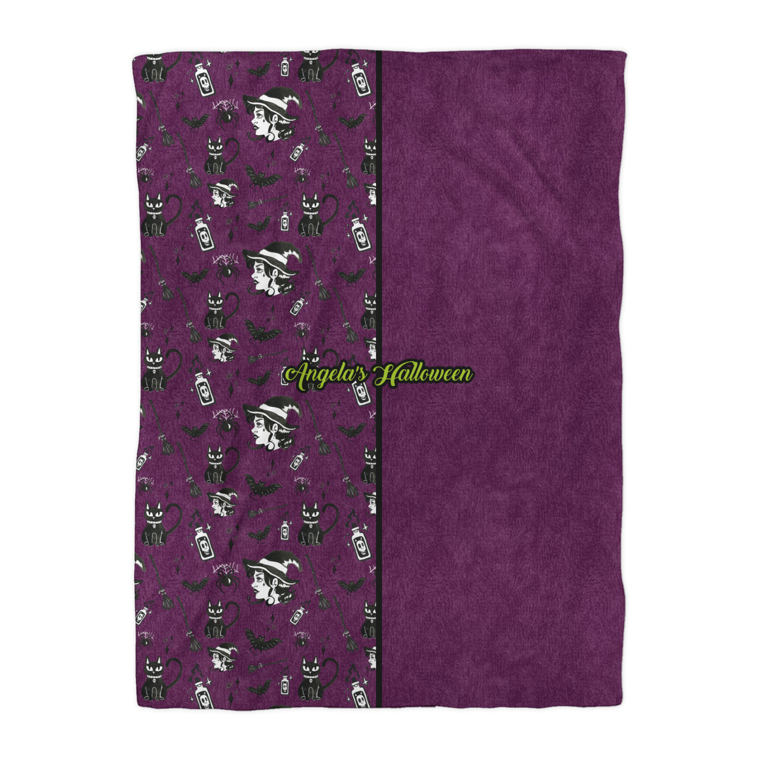 This fun design has a dark violet velvet looking (not real velvet - digital) background. On top of the digital velvet is a pattern full of beautiful illustrations of witches, potions, black cats, bats, and more. The main design is split in two with this background on one side and a plain violet digital velvet on the other. Your personalization is placed in the bottom right corner to give a lovely asymmetrical look. The coordinating design has a gorgeous large illustration of a witch with a little saying above and below her that says "I'll put a spell on you."