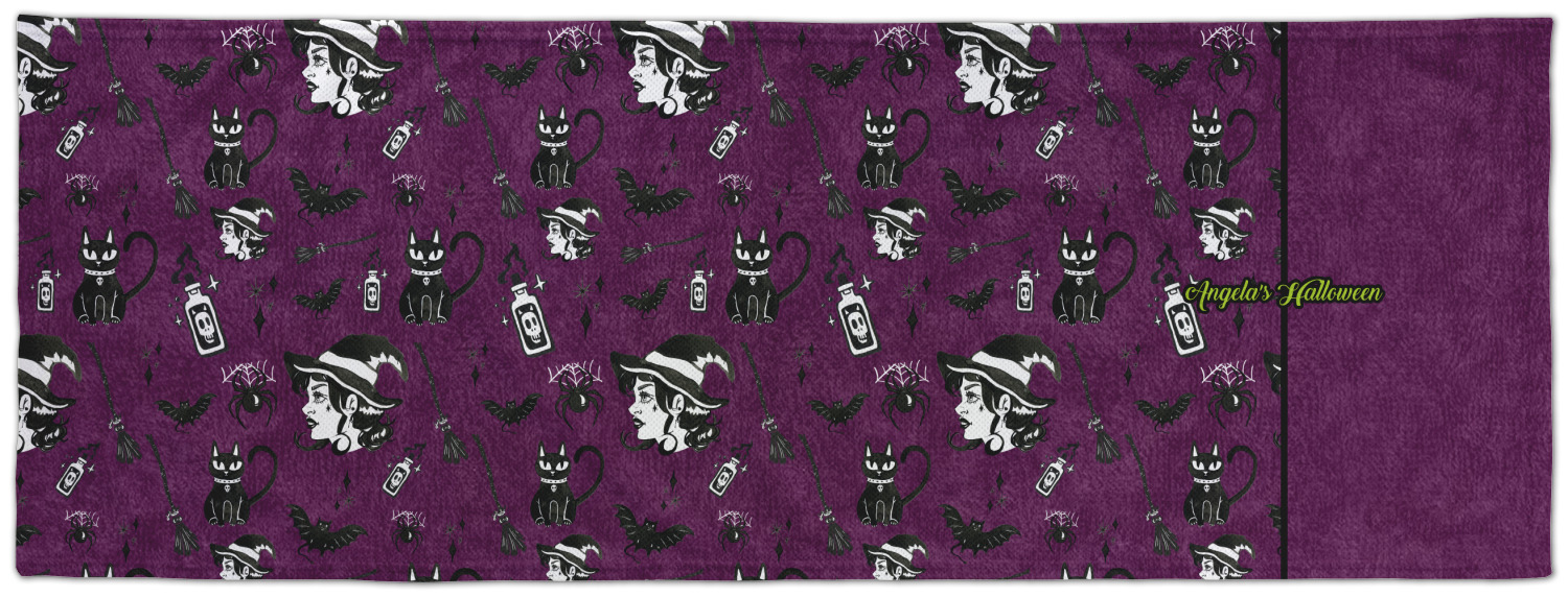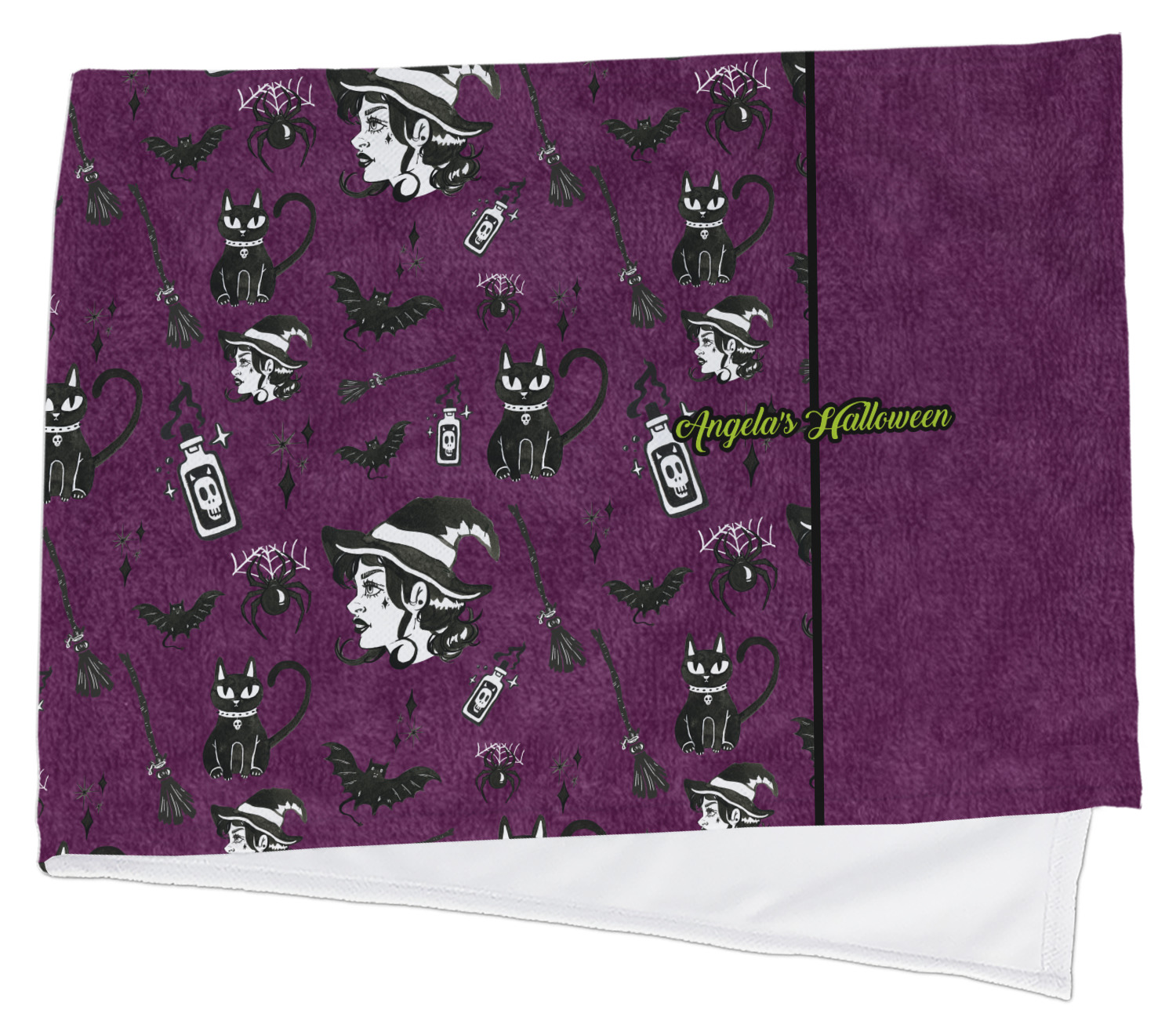 This fun design has a dark violet velvet looking (not real velvet - digital) background. On top of the digital velvet is a pattern full of beautiful illustrations of witches, potions, black cats, bats, and more. The main design is split in two with this background on one side and a plain violet digital velvet on the other. Your personalization is placed in the bottom right corner to give a lovely asymmetrical look. The coordinating design has a gorgeous large illustration of a witch with a little saying above and below her that says "I'll put a spell on you."