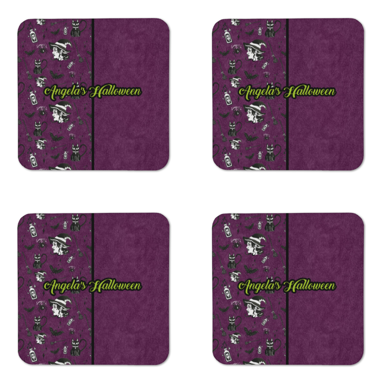 This fun design has a dark violet velvet looking (not real velvet - digital) background. On top of the digital velvet is a pattern full of beautiful illustrations of witches, potions, black cats, bats, and more. The main design is split in two with this background on one side and a plain violet digital velvet on the other. Your personalization is placed in the bottom right corner to give a lovely asymmetrical look. The coordinating design has a gorgeous large illustration of a witch with a little saying above and below her that says "I'll put a spell on you."