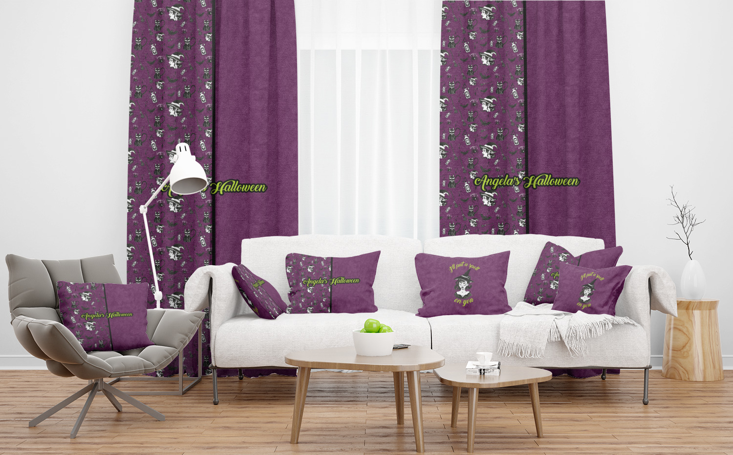 This fun design has a dark violet velvet looking (not real velvet - digital) background. On top of the digital velvet is a pattern full of beautiful illustrations of witches, potions, black cats, bats, and more. The main design is split in two with this background on one side and a plain violet digital velvet on the other. Your personalization is placed in the bottom right corner to give a lovely asymmetrical look. The coordinating design has a gorgeous large illustration of a witch with a little saying above and below her that says "I'll put a spell on you."